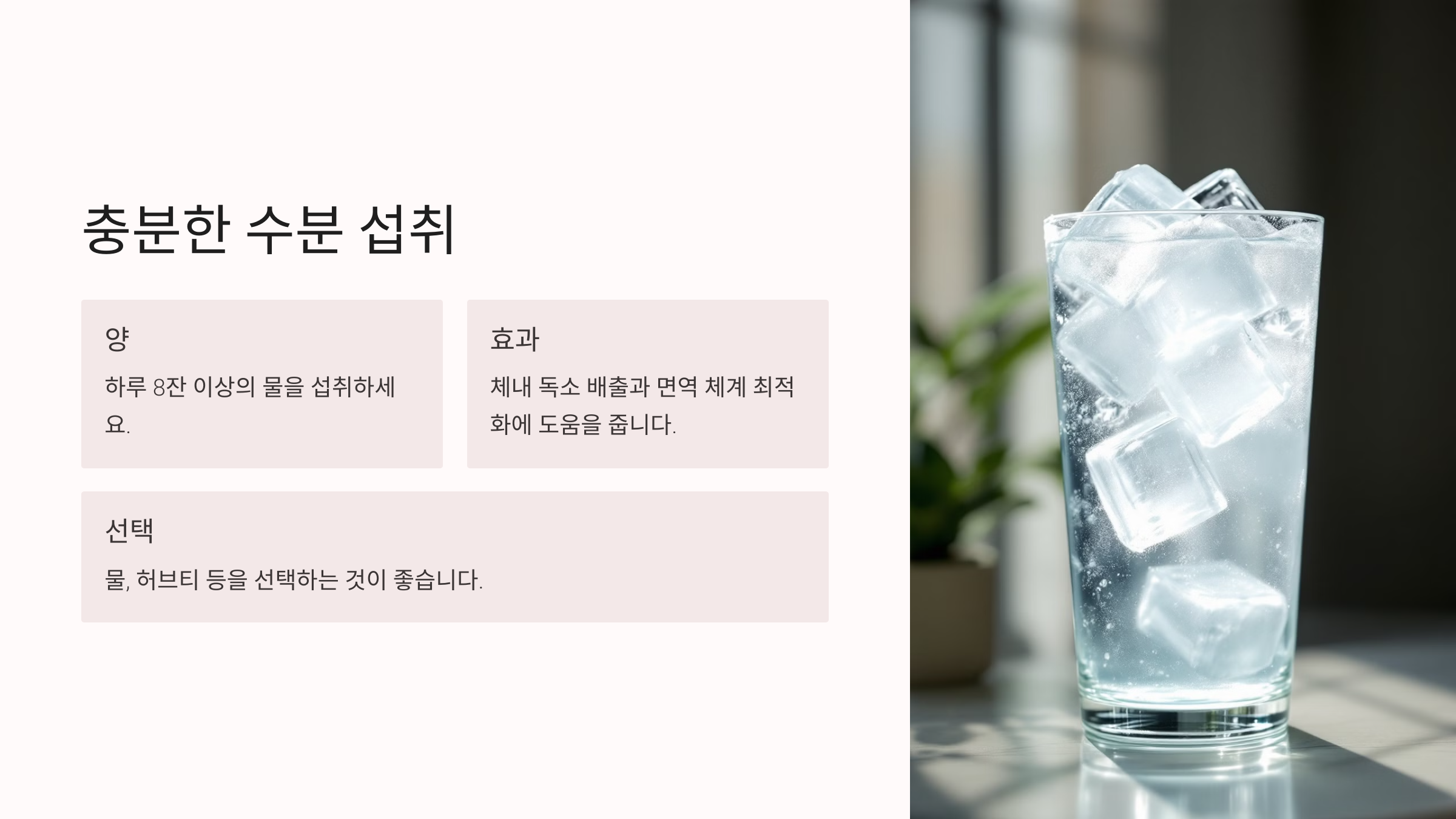 물은 체내 독소를 배출하고, 면역 체계를 최적화하는 데 도움을 줍니다.