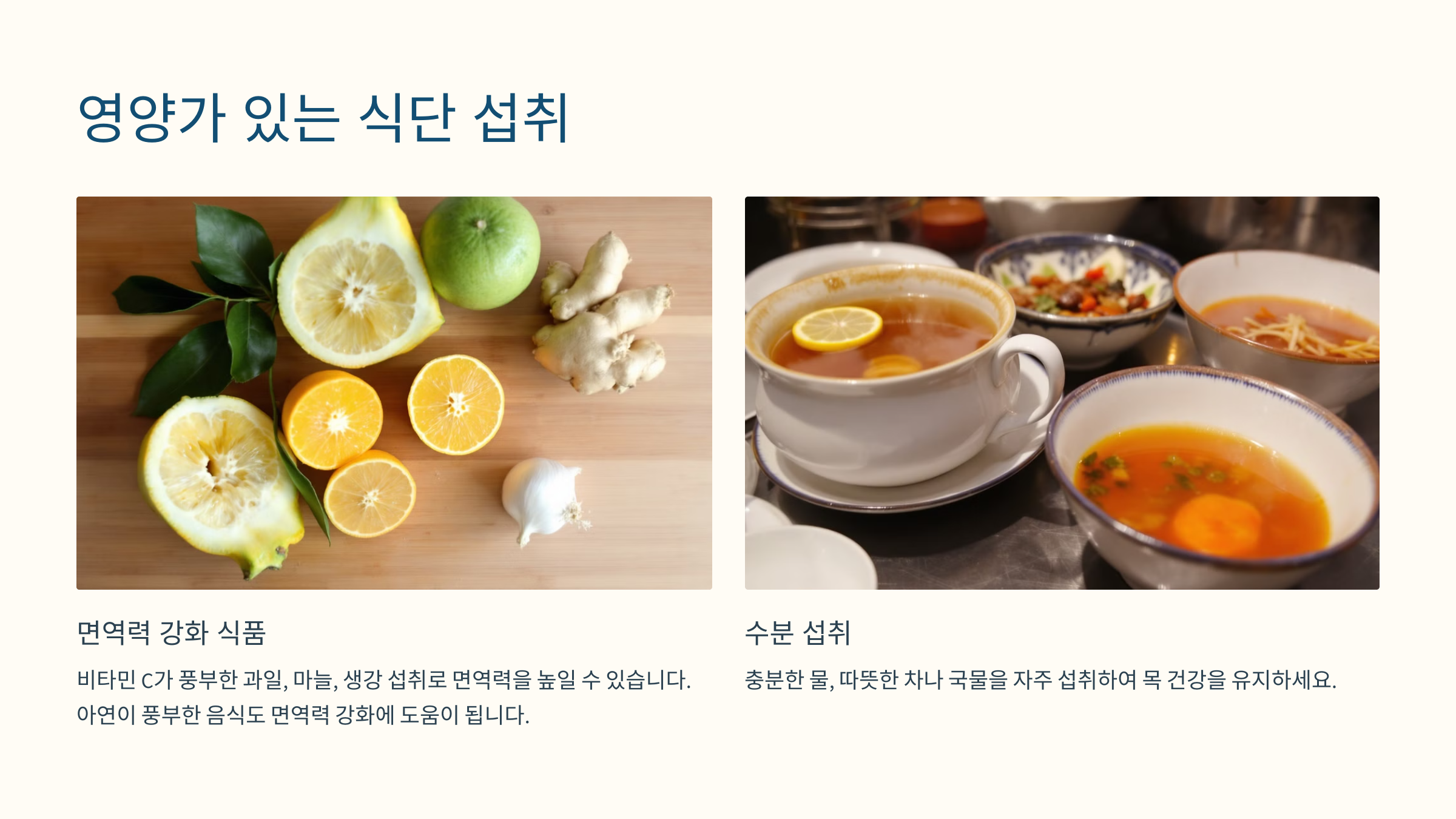 균형 잡힌 식단은 건강한 면역 시스템을 유지하는 데 기본이 돼요. 비타민 C가 풍부한 감귤류 과일, 키위, 그리고 면역력을 높이는 마늘, 생강 같은 식재료를 자주 섭취해 보세요. 특히 아연이 풍부한 음식은 바이러스 퇴치에 도움을 줄 수 있답니다.