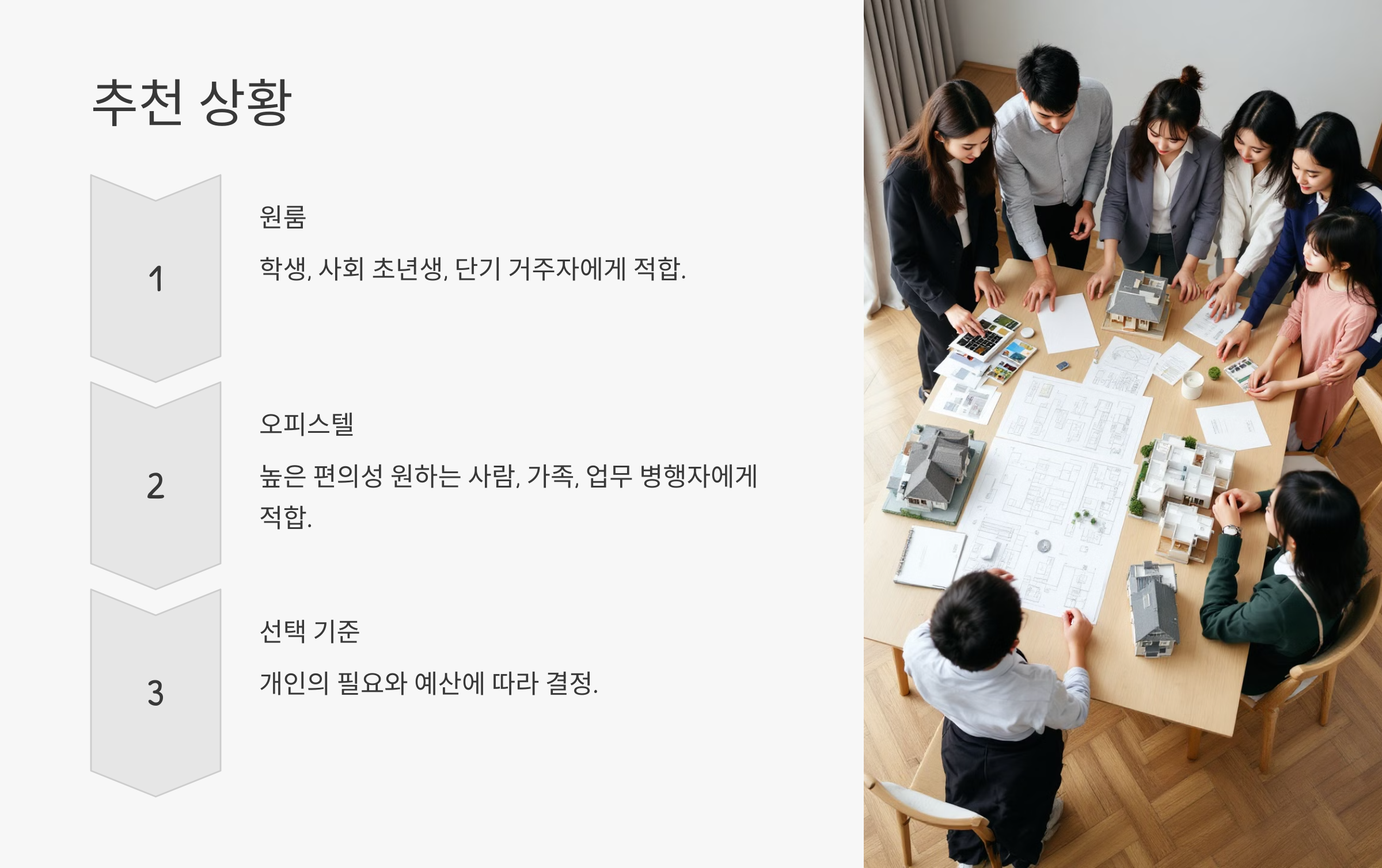 오피스텔은 좀 더 높은 수준의 생활 편의성을 원하는 사람들에게 추천할 수 있어요. 공간이 넓고 시설이 잘 갖춰져 있어 가족과 함께 거주하거나, 업무와 주거를 병행하려는 사람들에게 더 적합해요. 또한 자차를 이용하는 사람이라면 주차 시설이 잘 갖춰진 오피스텔이 훨씬 유리해요.