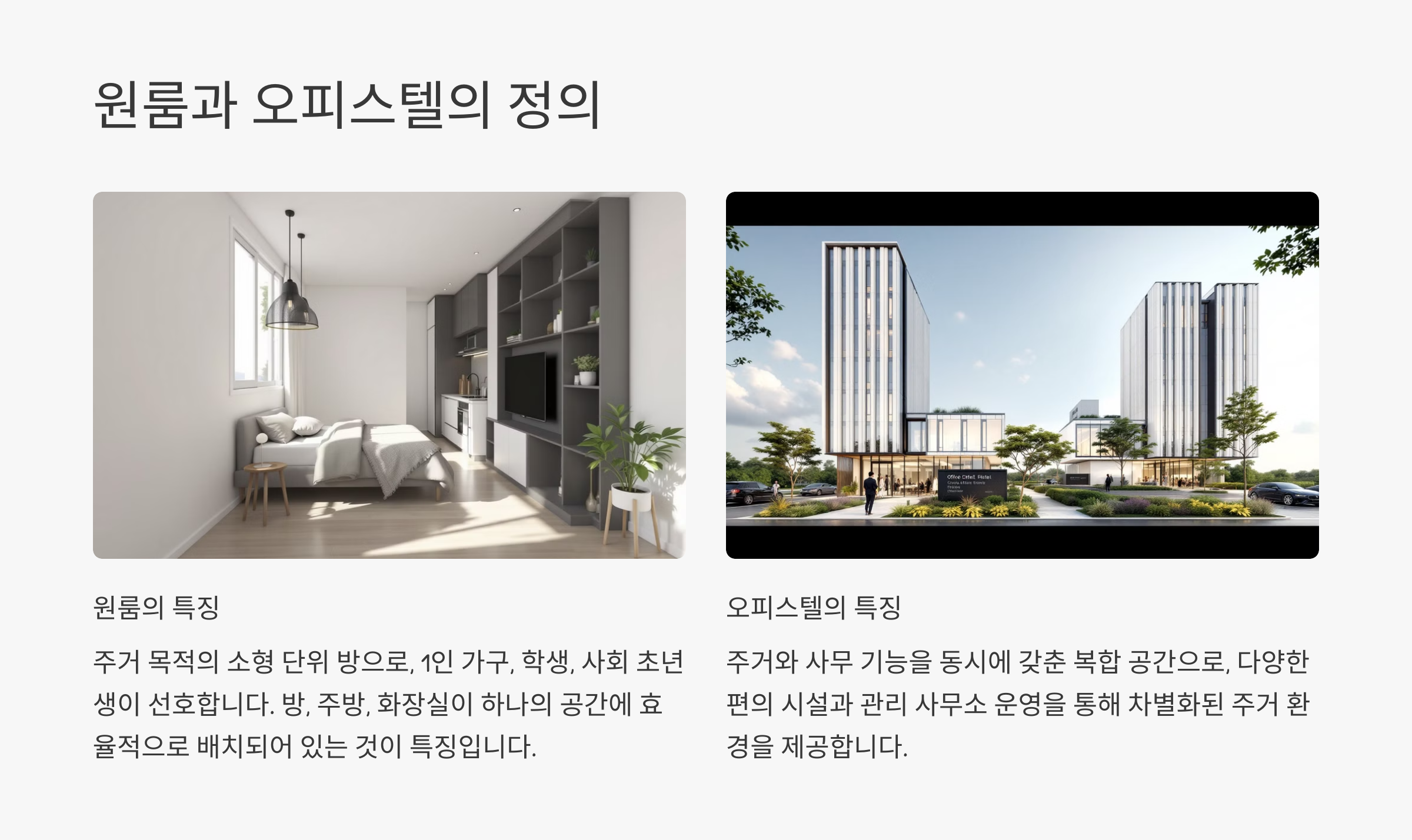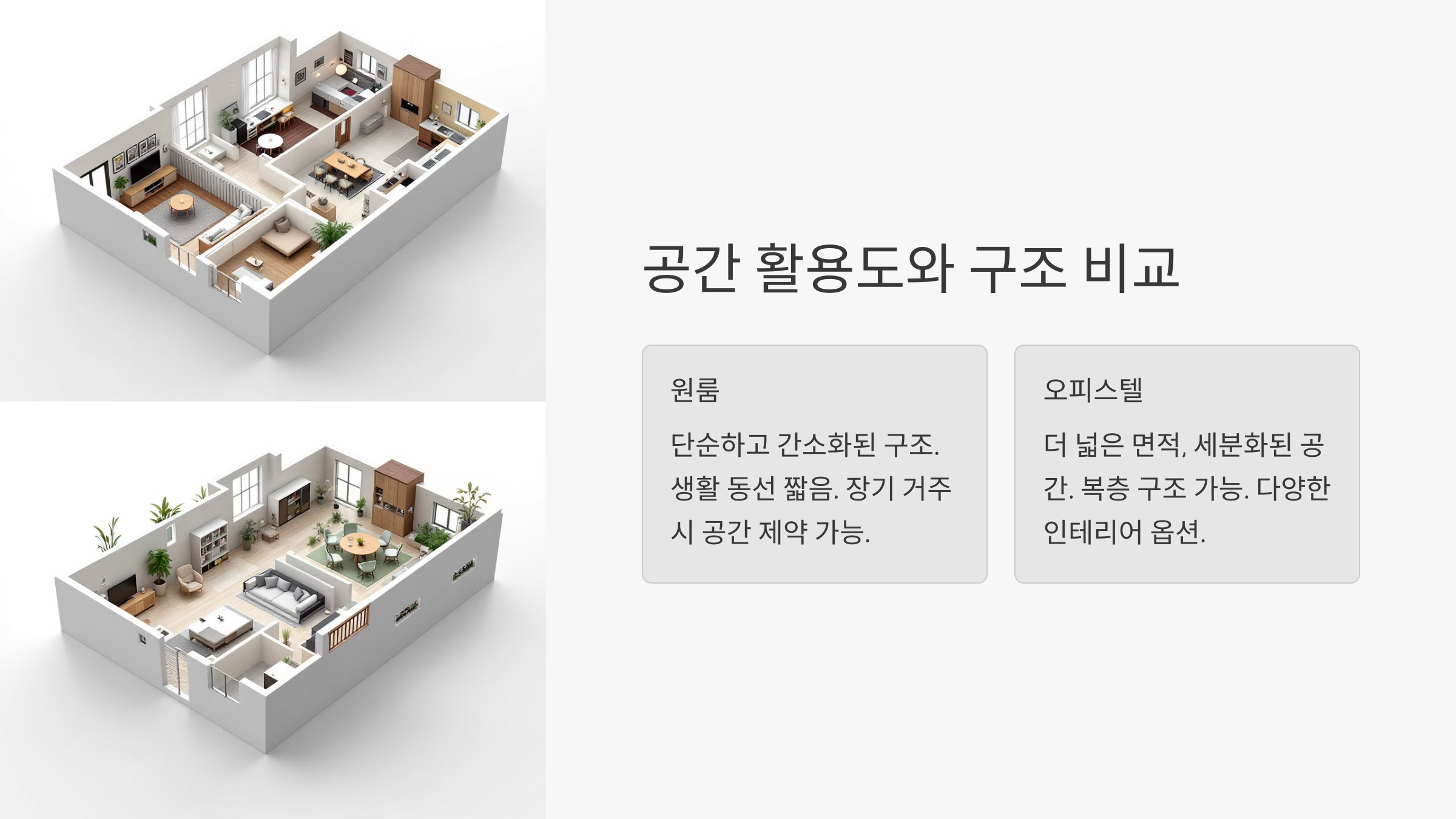 A1. 원룸은 주거용으로 설계된 소형 공간이고, 오피스텔은 업무와 주거를 병행할 수 있도록 설계된 공간이에요. 시설, 구조, 법적 분류에서 차이가 있어요.