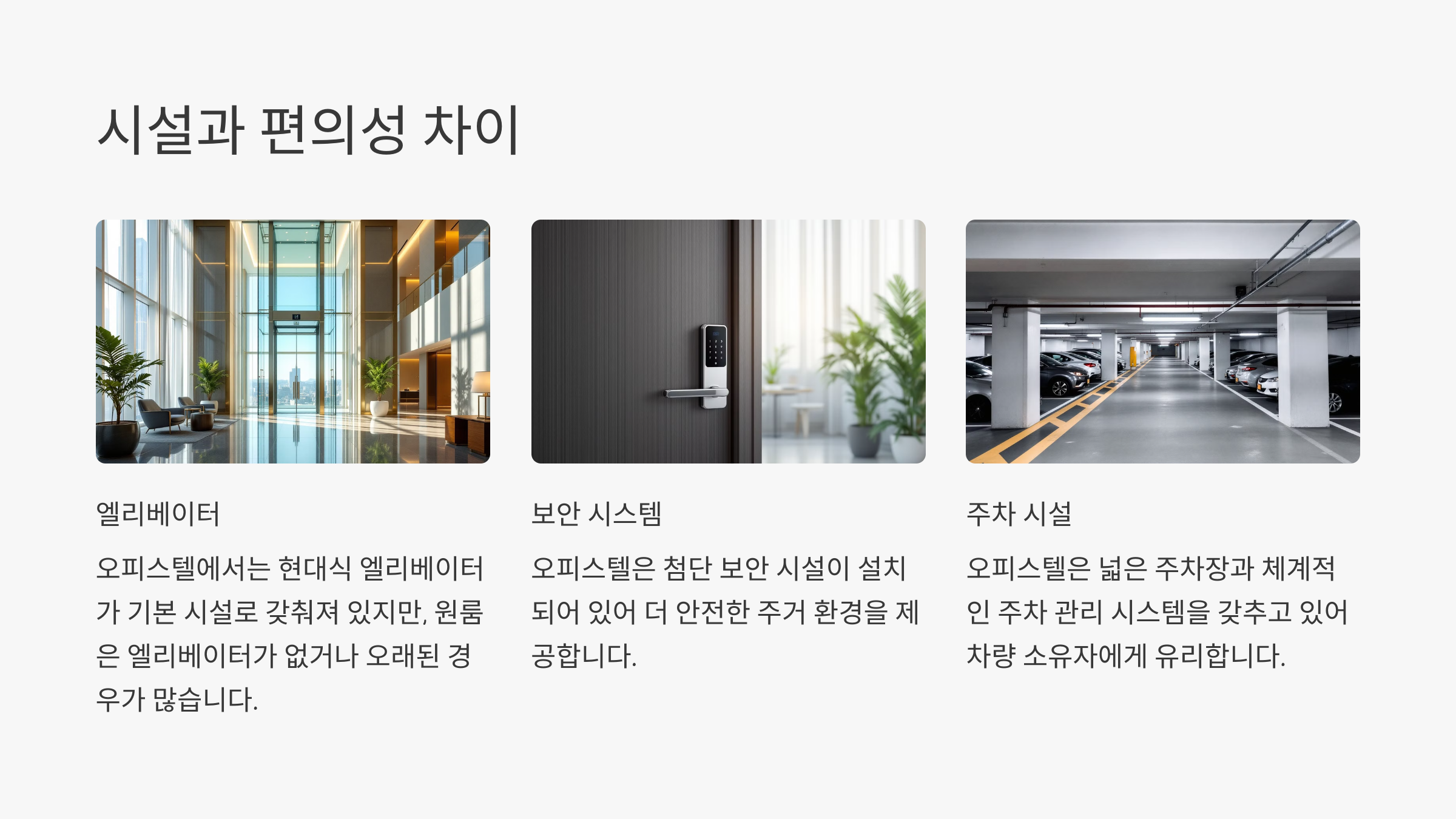 반면 오피스텔은 최신 설계가 반영된 경우가 많아 보안 시스템, 엘리베이터, 주차장 등이 잘 갖춰져 있어요. 어떤 곳은 피트니스 센터나 라운지 같은 부대시설도 제공된답니다. 이러한 요소는 생활의 편리함과 품질을 높여주는 장점으로 작용해요.