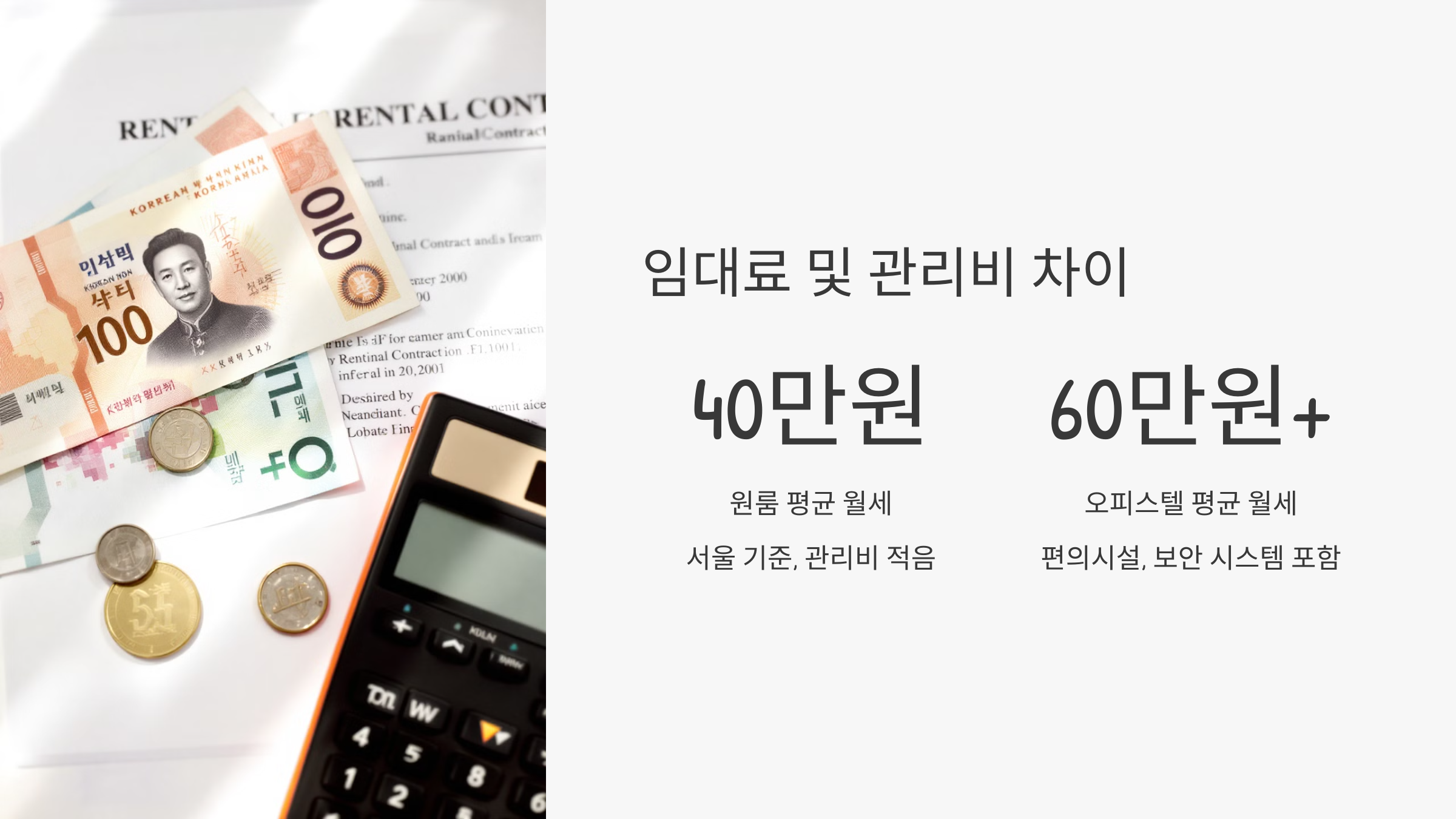 오피스텔은 원룸보다 임대료와 관리비가 높은 편이에요. 일반적으로 건물 내 다양한 편의 시설과 보안 시스템이 제공되기 때문에 그만큼 비용이 더 발생한답니다. 특히 주차장 사용료나 공용 공간 관리비 등 추가적인 금액이 들어가는 경우가 많아요.