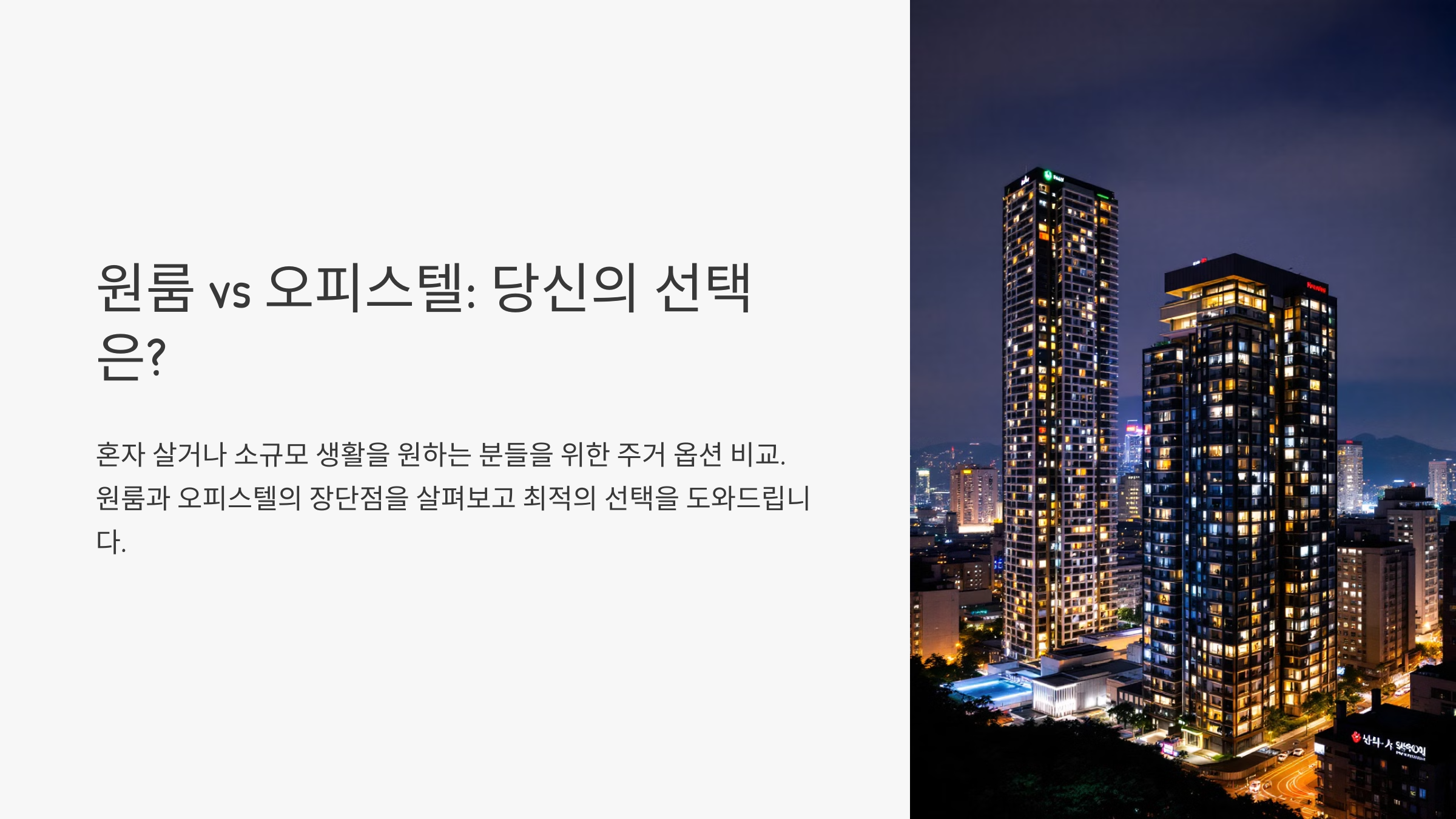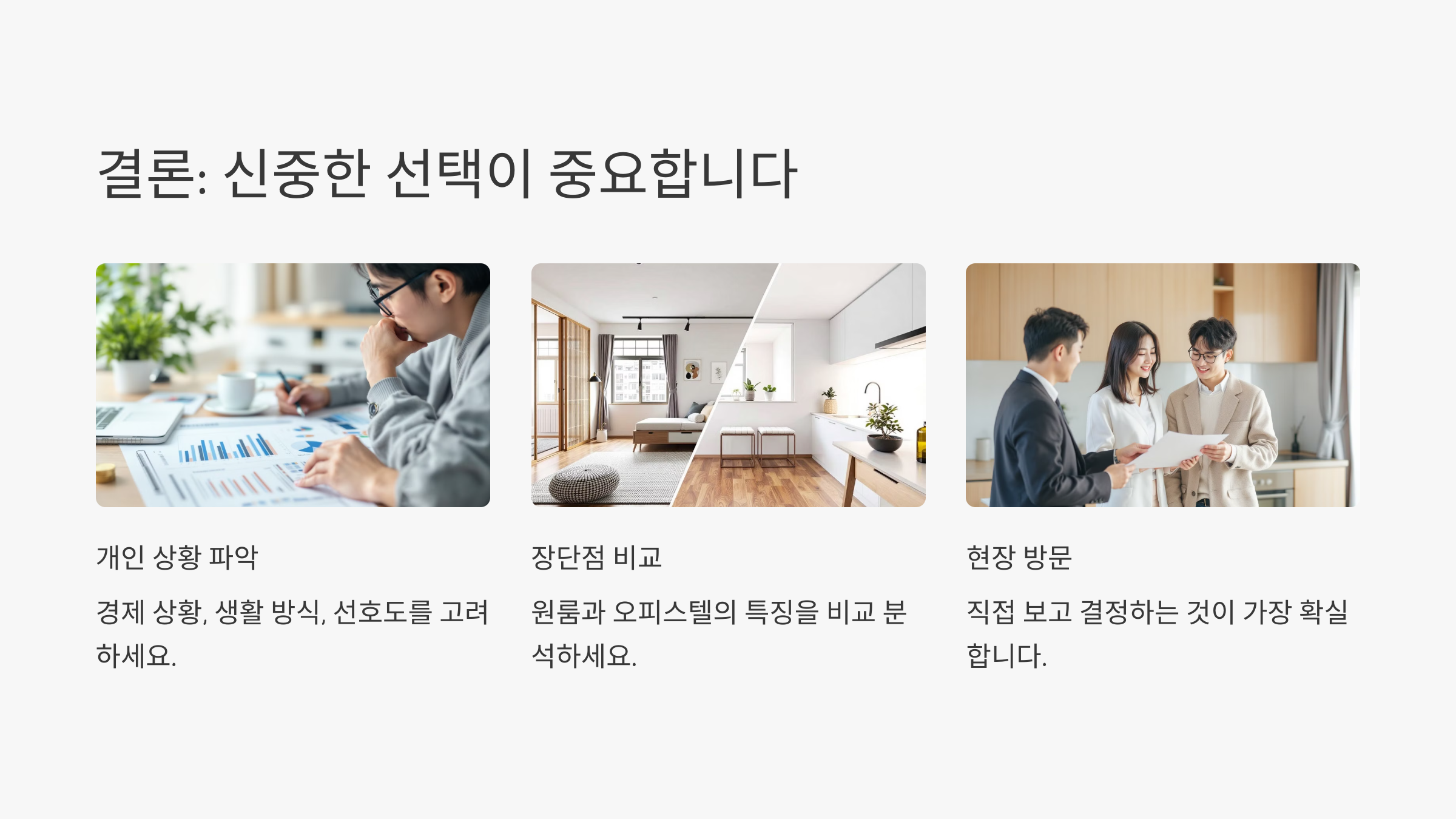 결국 선택은 개인의 필요와 예산에 따라 달라져요. 주거를 최우선으로 고려한다면 원룸, 다목적성과 품질을 중시한다면 오피스텔이 좋은 선택일 수 있답니다.