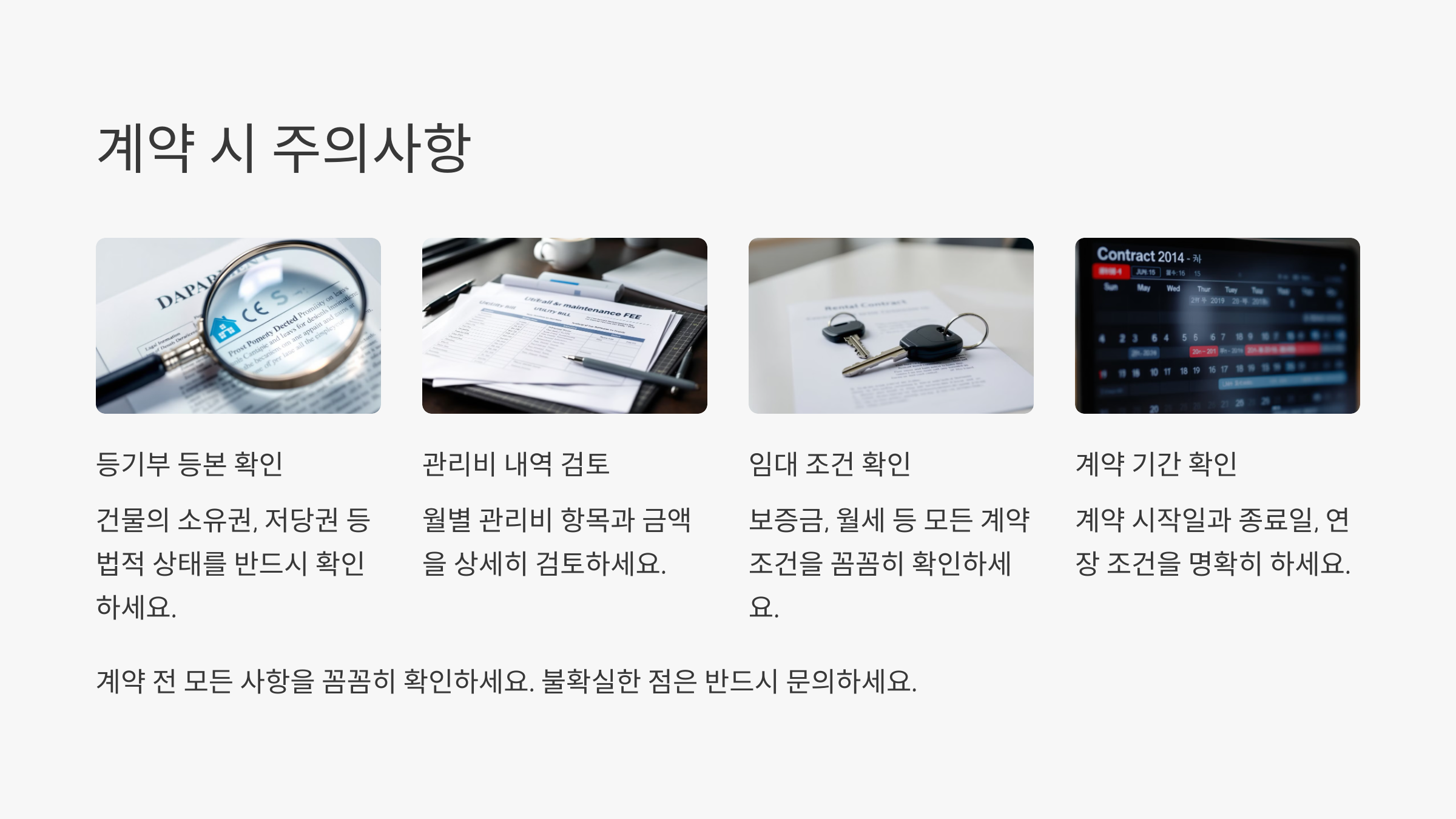 A4. 등기부 등본 확인, 관리비 내역, 임대 조건, 그리고 계약 기간 등을 꼼꼼히 살펴야 해요.
