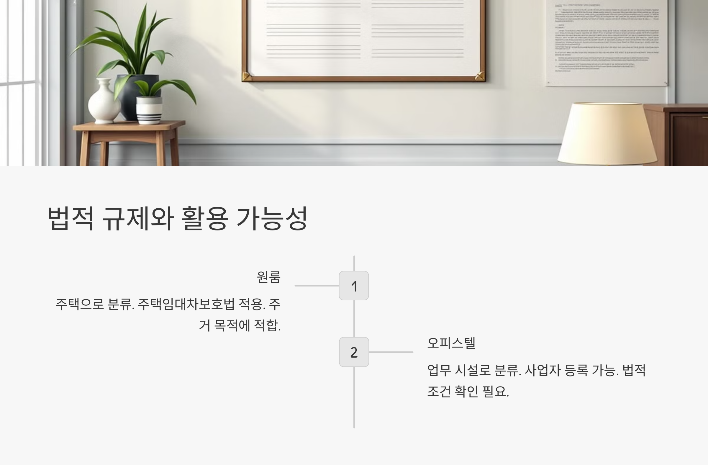 오피스텔은 건축법상 업무 시설로 분류되어 있어요. 일부는 주거용으로 사용할 수 있도록 설계되었지만, 법적으로 주택이 아니기 때문에 주택임대차보호법이 적용되지 않는 경우도 있어요. 따라서 계약 전에 관련 법적 조건을 꼼꼼히 확인해야 한답니다.