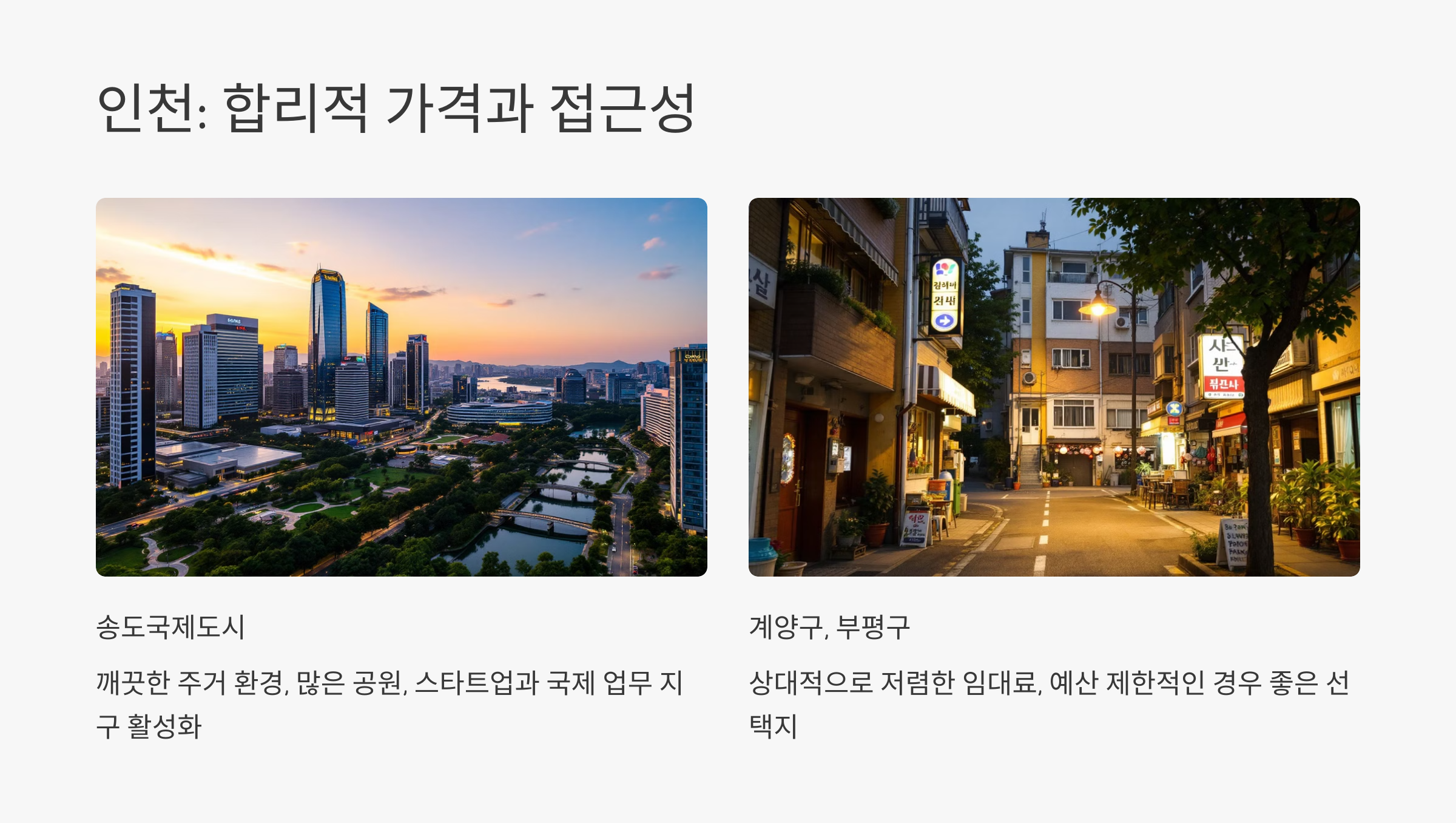 송도는 깨끗한 주거 환경과 공원이 많아 쾌적한 생활이 가능해요. 게다가 스타트업과 국제 업무 지구가 활성화되어 있어서 젊은 직장인들에게 인기가 많아요. 계양구나 부평구는 상대적으로 임대료가 더 저렴해서 예산이 제한적인 경우 좋은 선택지가 될 수 있어요.