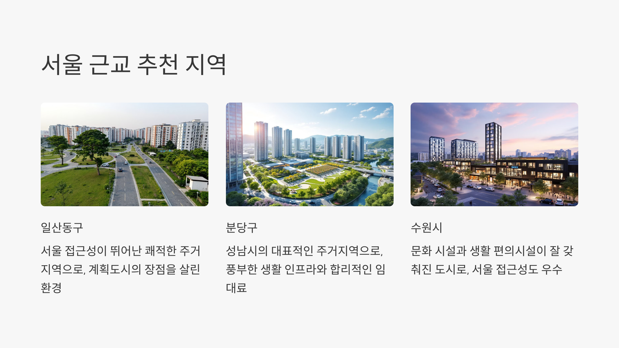 A6. 경기도 고양시 일산동구, 성남시 분당구 등이 추천돼요. 교통이 편리하고 임대료가 서울보다 저렴해요.