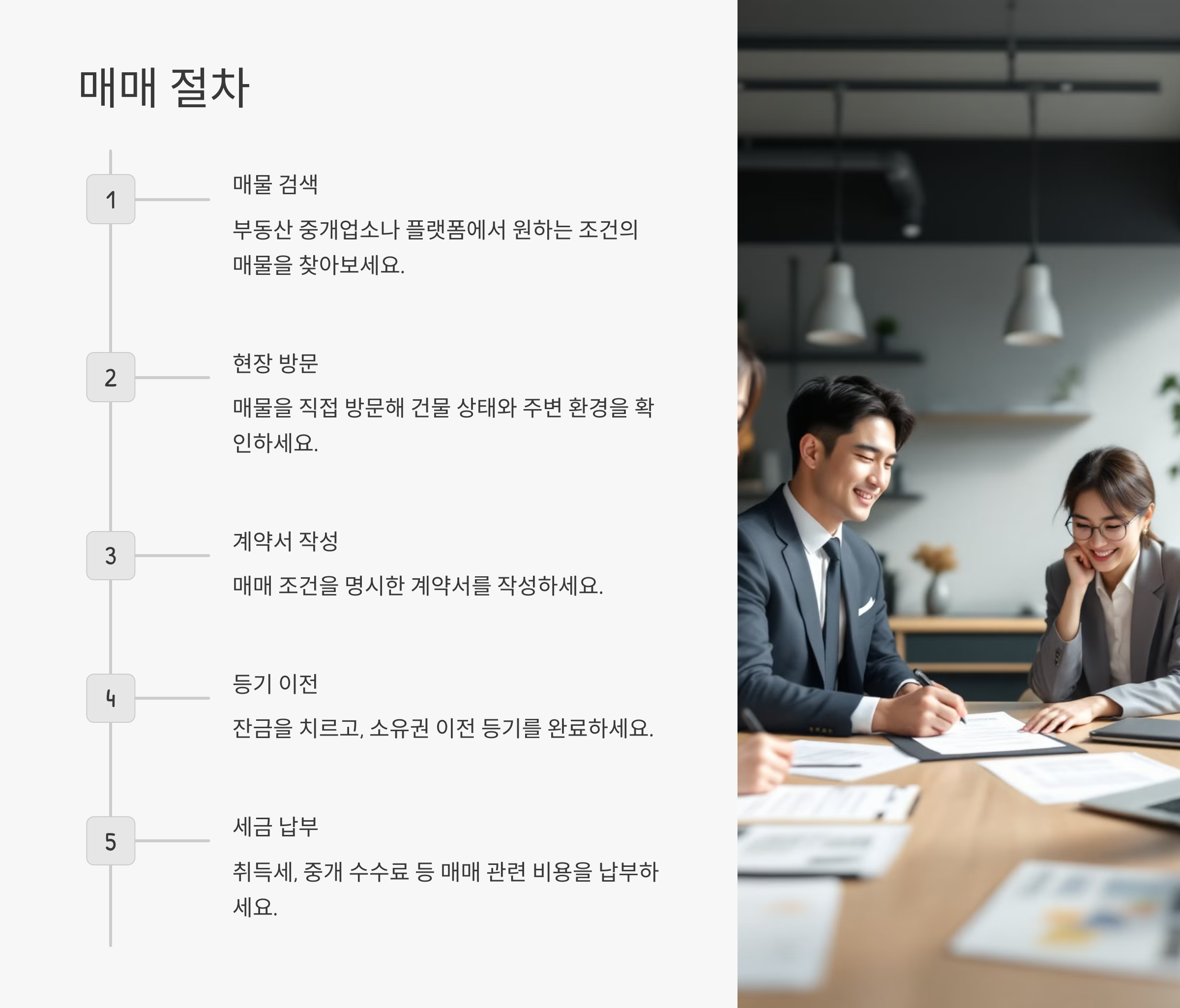 - 전문가 상담: 법적 문제나 매매 절차가 익숙하지 않다면 부동산 전문가의 도움을 받으세요.