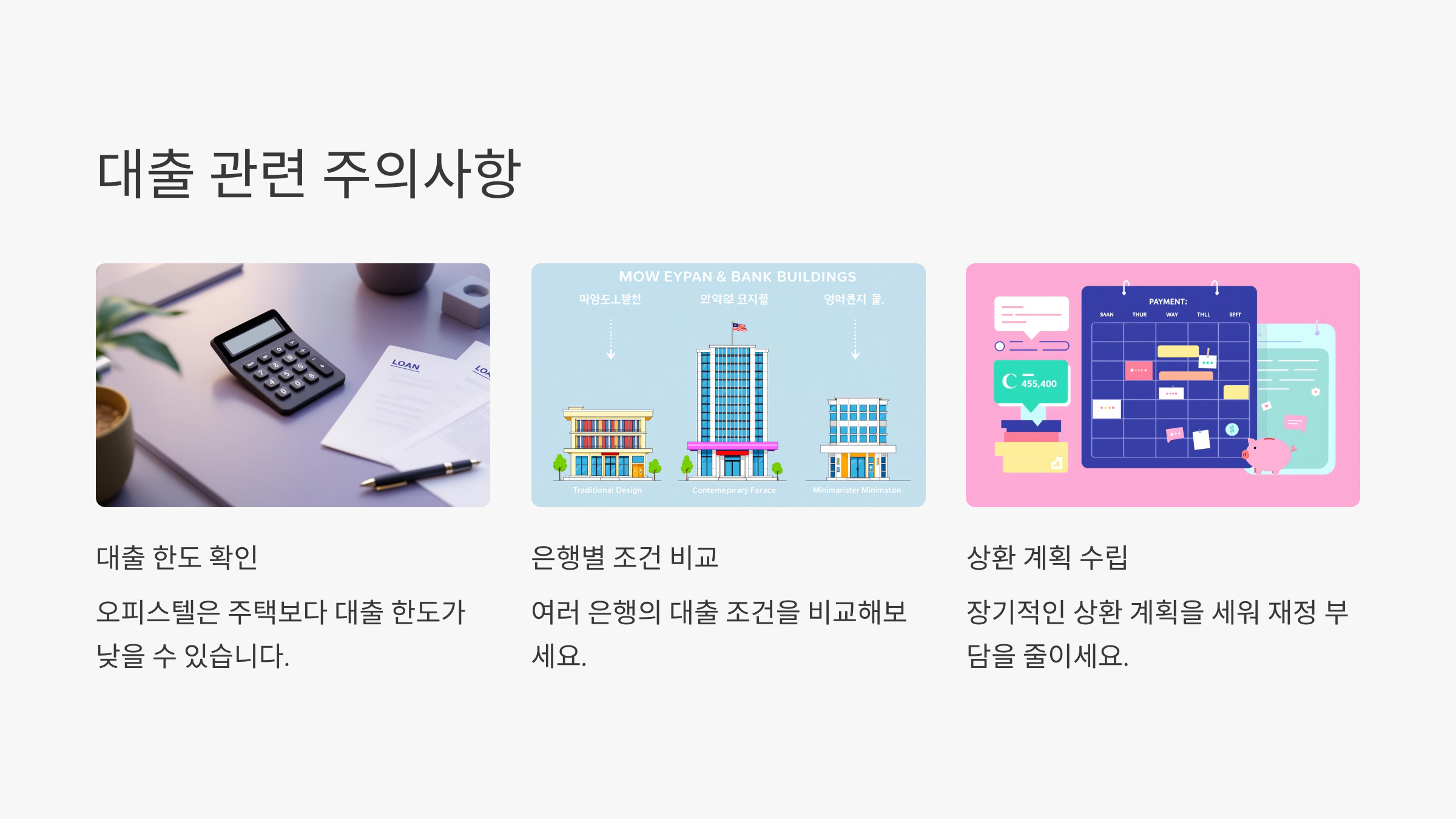 A8. 오피스텔은 대출 한도가 낮을 수 있으니, 은행별 조건을 비교하고 상환 가능성을 충분히 고려하세요.