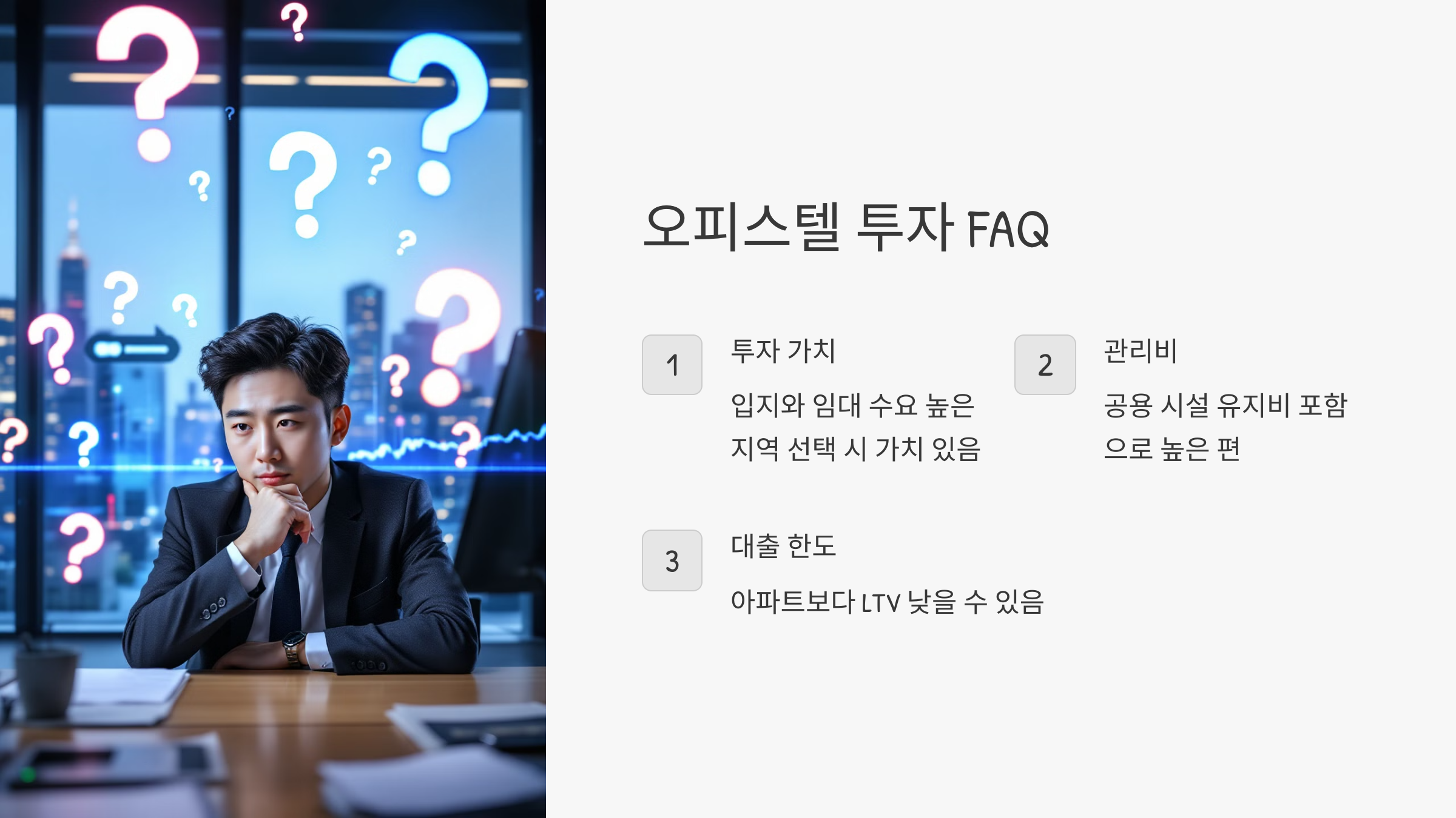 A4. 오피스텔은 주택담보대출비율(LTV)이 아파트보다 낮을 수 있어요. 은행별 대출 조건을 사전에 확인하세요.