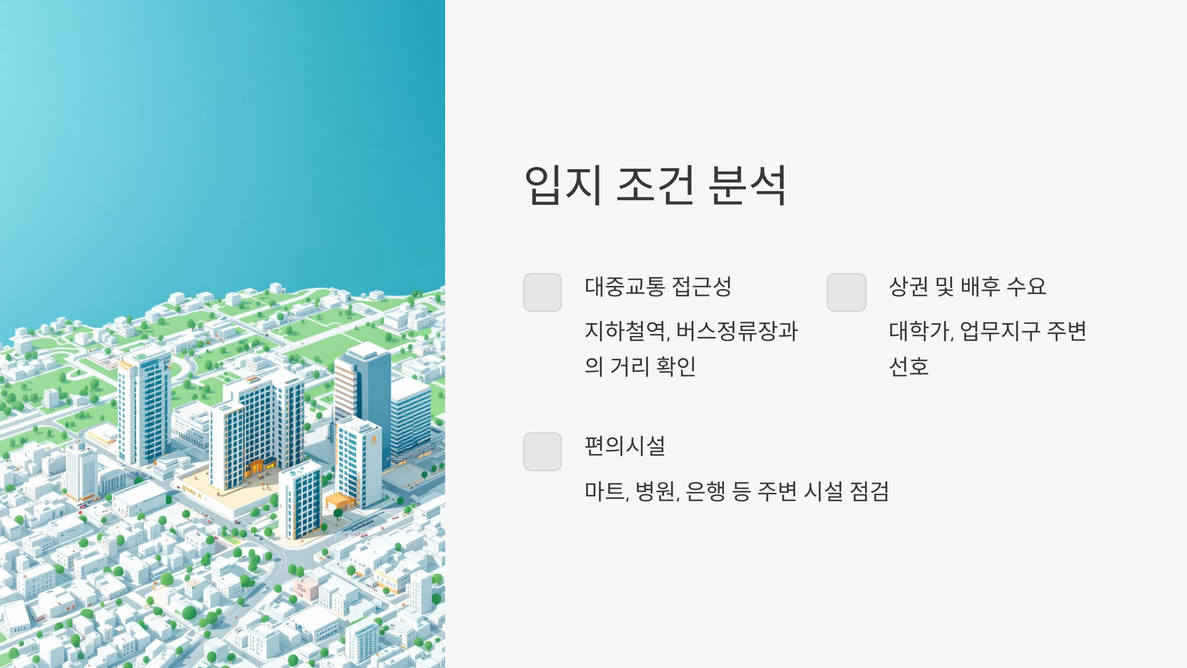 입지 분석 시, 주변 편의시설(마트, 병원, 은행 등)과 환경(소음, 교통 혼잡도 등)도 고려해야 해요. 이러한 조건은 거주자뿐만 아니라 임대인에게도 중요한 결정 요소가 된답니다.