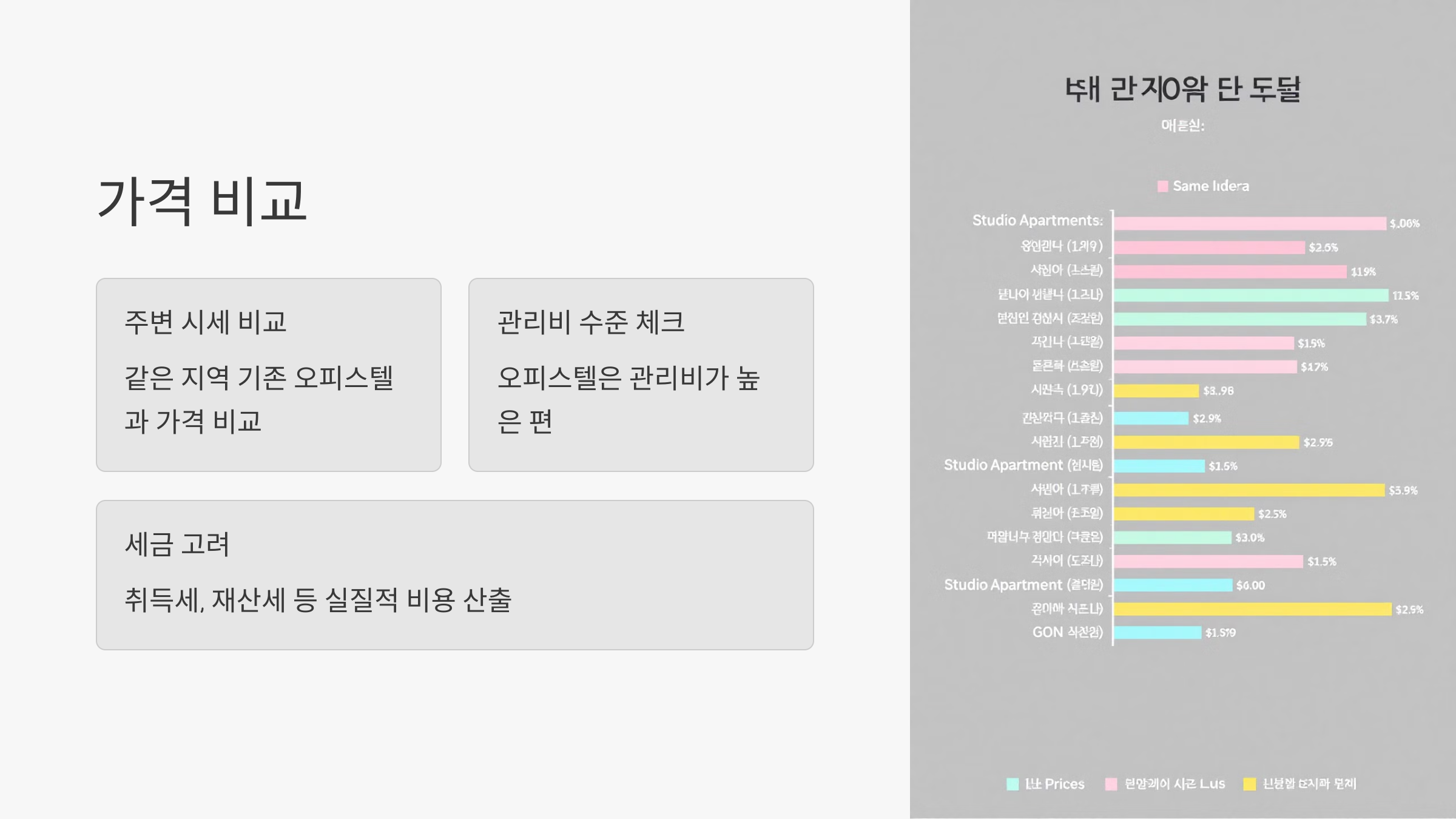 가격 비교 시, 분양가와 함께 관리비 수준도 체크해야 해요. 오피스텔은 다른 주거 형태에 비해 관리비가 높은 편인데, 이 비용은 실거주자나 임차인에게 부담이 될 수 있어요.