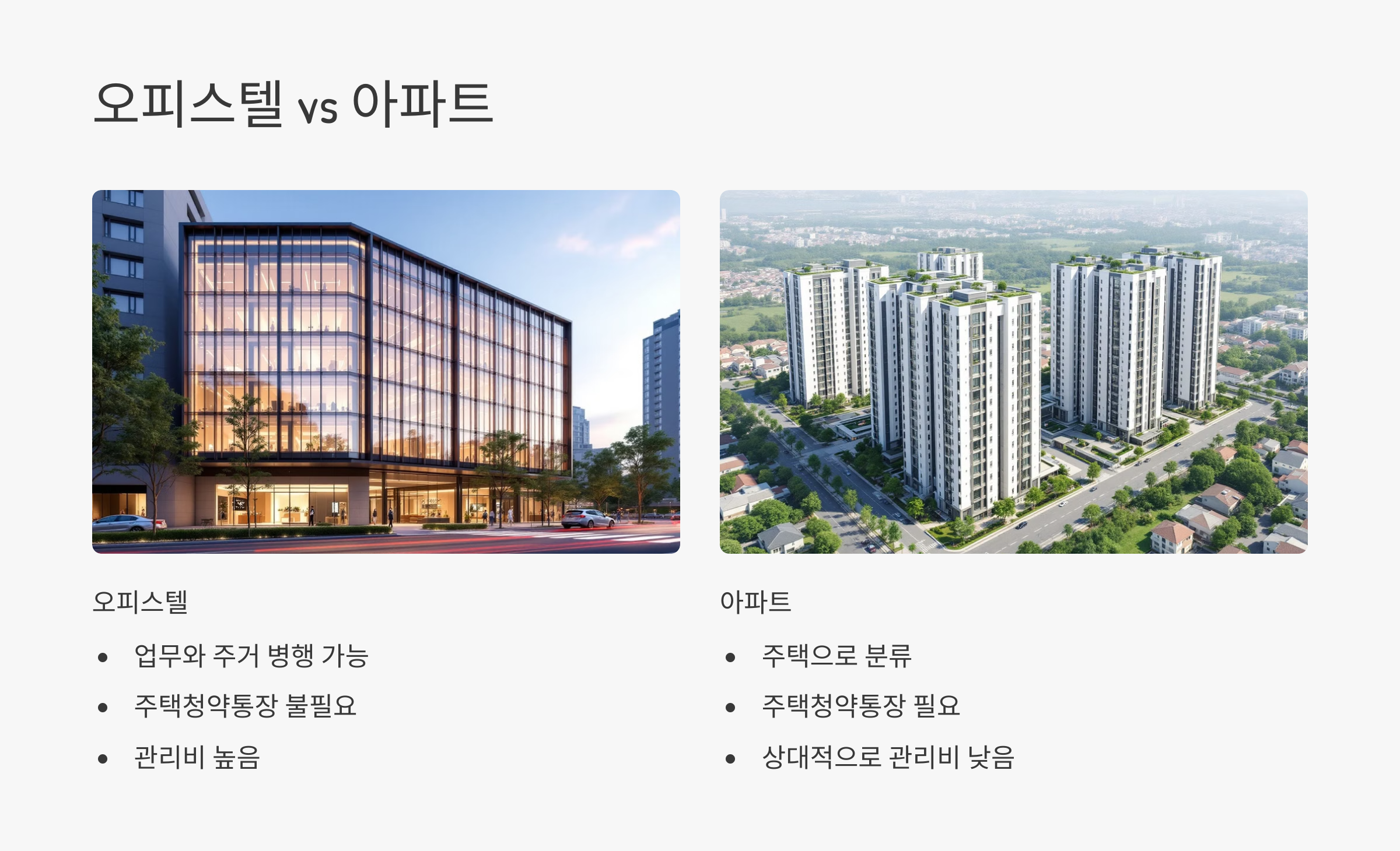 A1. 오피스텔은 업무와 주거를 병행할 수 있는 공간으로 설계되며, 주택으로 분류되지 않아 주택청약통장이 필요 없어요. 반면, 아파트는 주택으로 분류돼요.