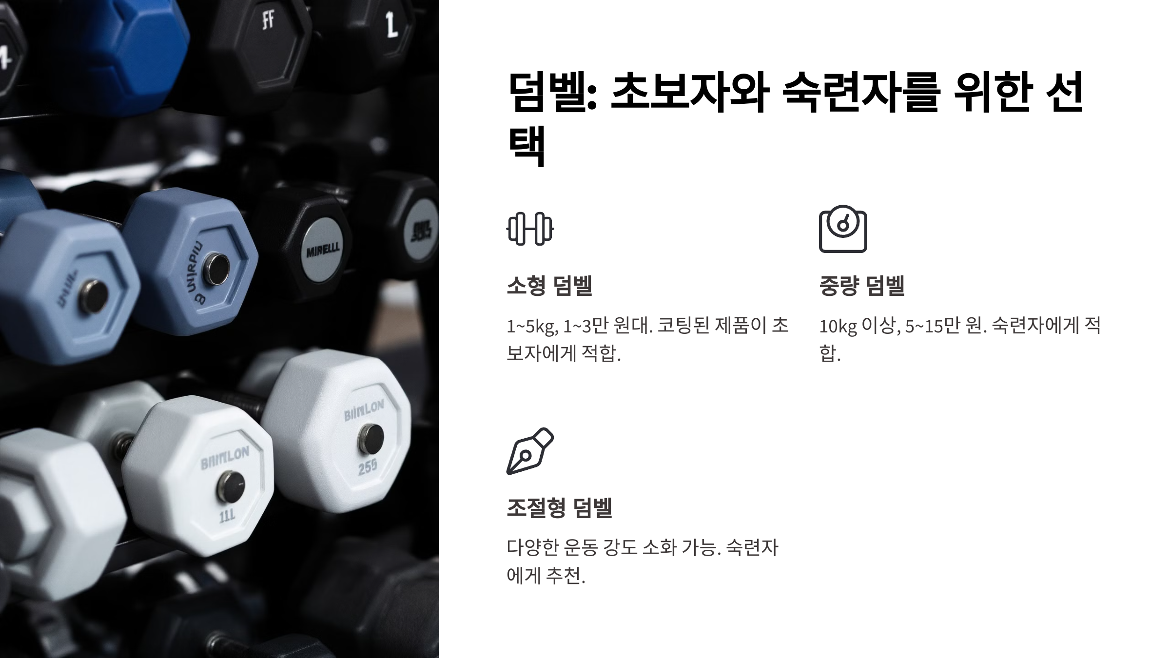 초보자는 코팅된 소형 덤벨을 선택해요. 이 제품은 그립감이 좋고 손을 보호해 초보자에게 적합해요. 숙련자는 조절 가능한 무게의 조립형 덤벨을 선택하면 다양한 운동 강도를 소화할 수 있어요.