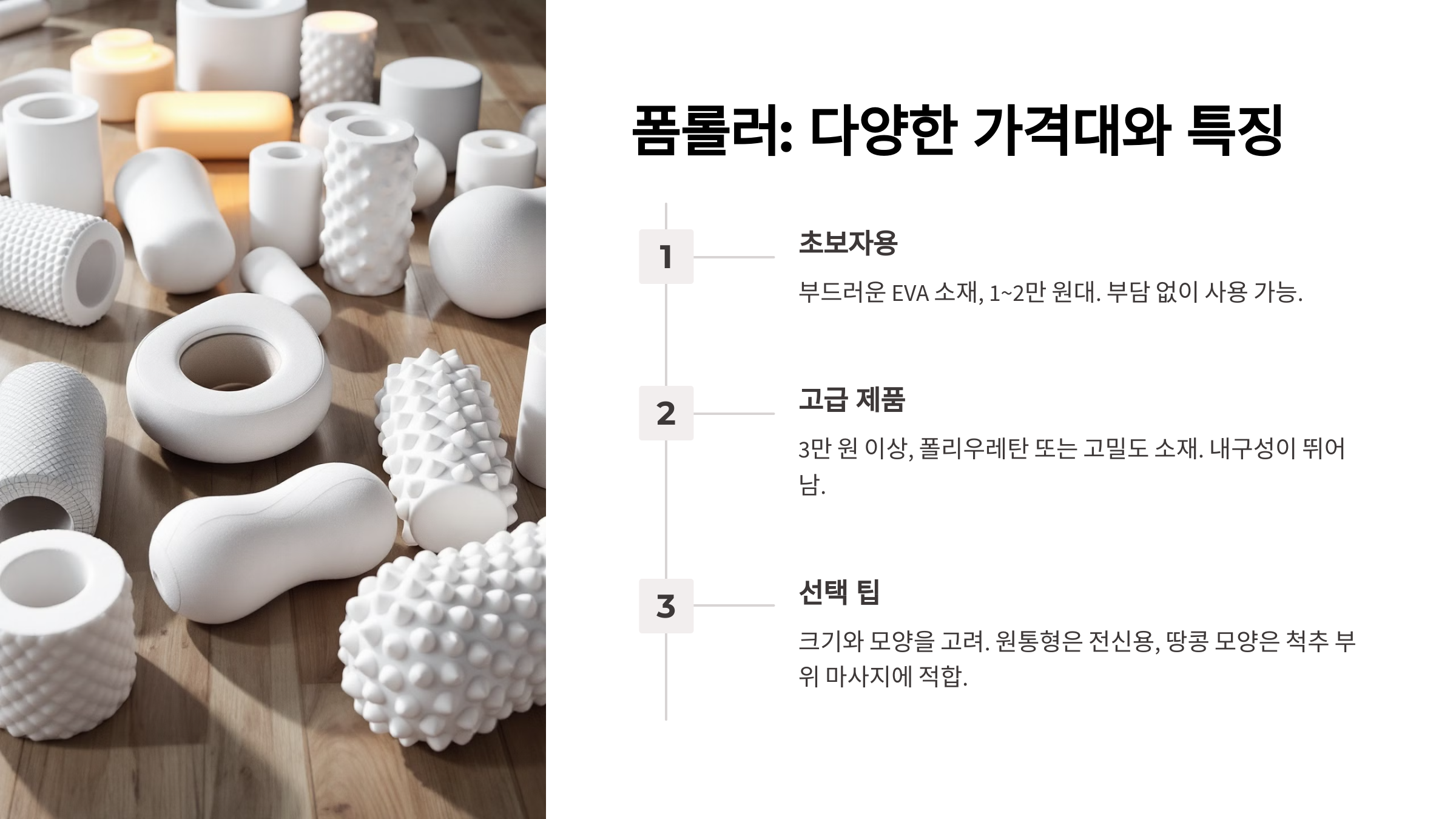 폼롤러는 근육 이완과 회복을 돕는 도구로, 운동 전후 마사지에 사용돼요. 가격대는 1만 원에서 5만 원 사이로, 소재와 밀도에 따라 다르게 형성되어 있어요. 초보자는 부드러운 EVA 소재의 폼롤러를 선택하면 부담 없이 사용할 수 있어요.