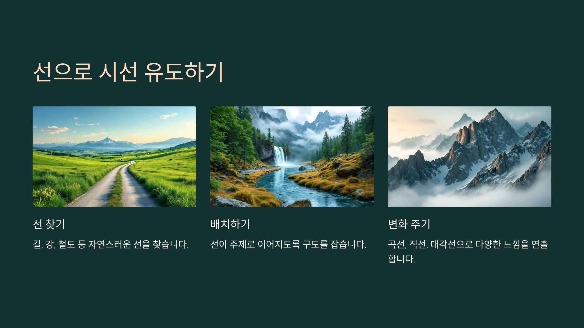 길, 강, 철도 같은 선은 관객의 시선을 유도하는 강력한 도구입니다.