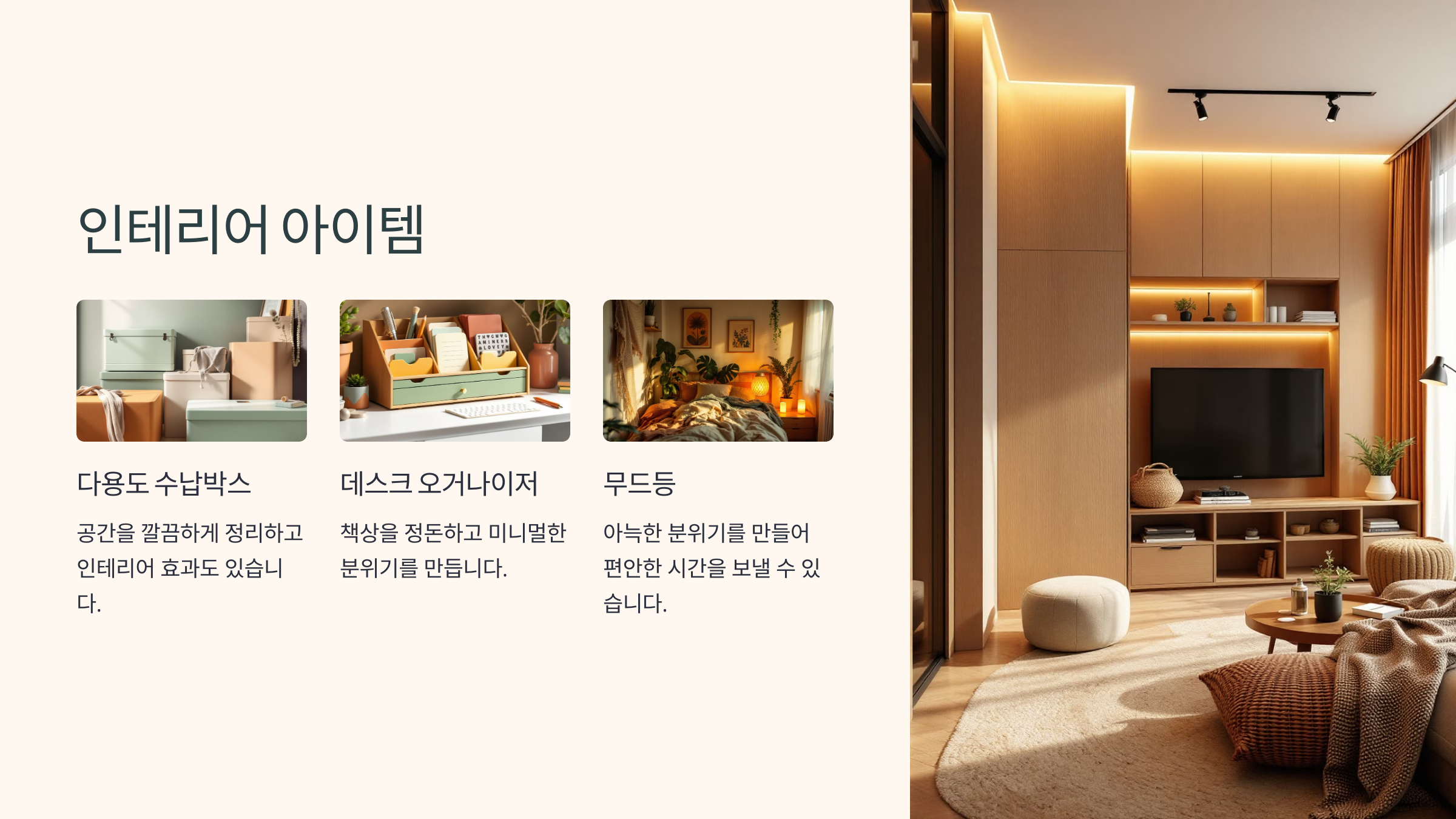 책상 위를 정돈할 수 있는 데스크 오거나이저도 추천해요. 요즘은 미니멀리즘 디자인이 인기라 심플한 스타일이 많이 사랑받고 있어요. 여기에 아늑한 분위기를 만들어주는 무드등을 더한다면 방 안에서의 시간을 훨씬 편안하게 보낼 수 있어요.