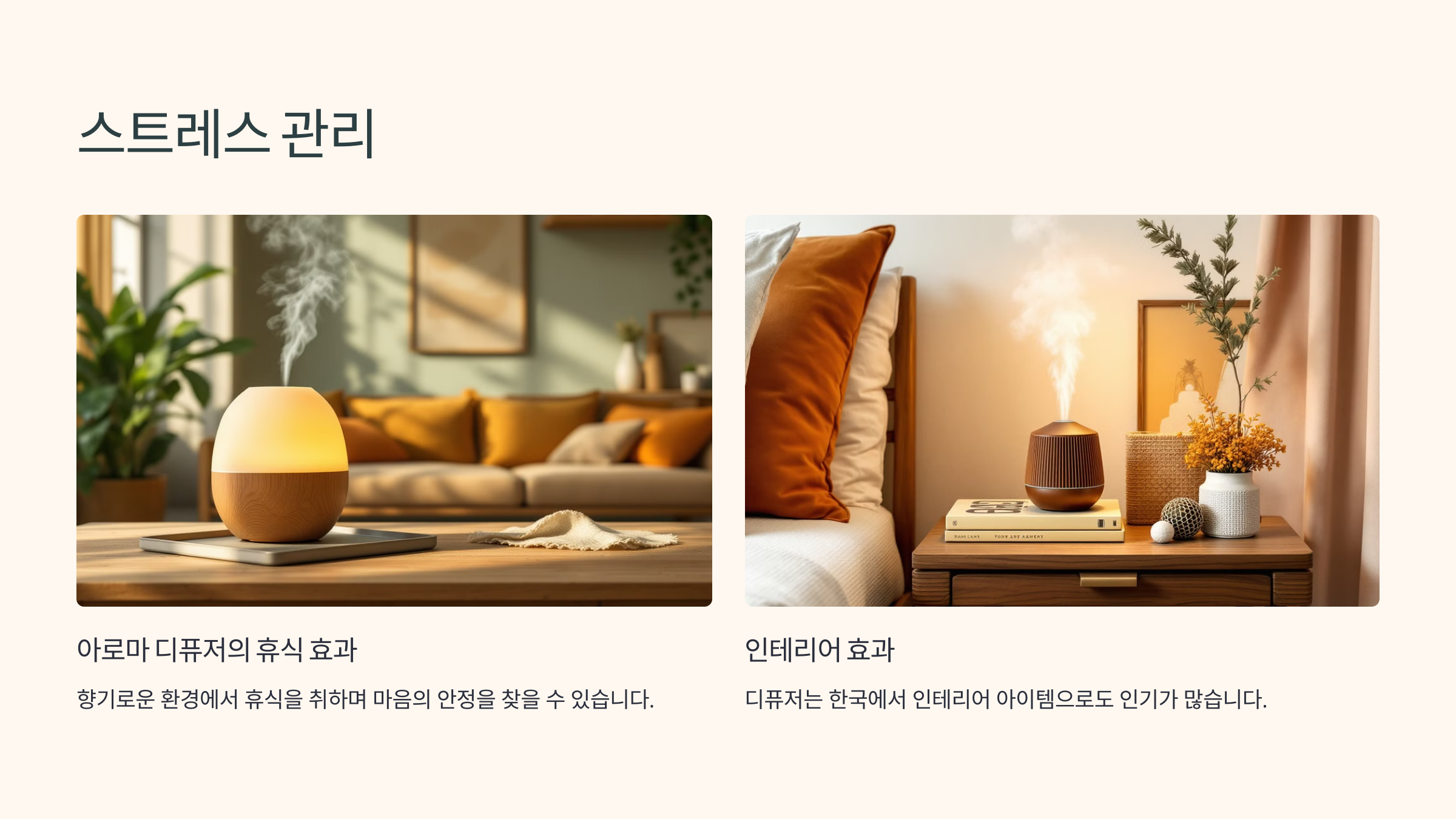 마지막으로, 스트레스를 줄여주는 아로마 디퓨저를 추천해요. 긴 하루를 마무리하며 향기로운 환경에서 휴식을 취하면 마음의 안정을 찾을 수 있답니다. 한국에서도 이런 디퓨저는 인테리어 아이템으로도 인기가 많아요.