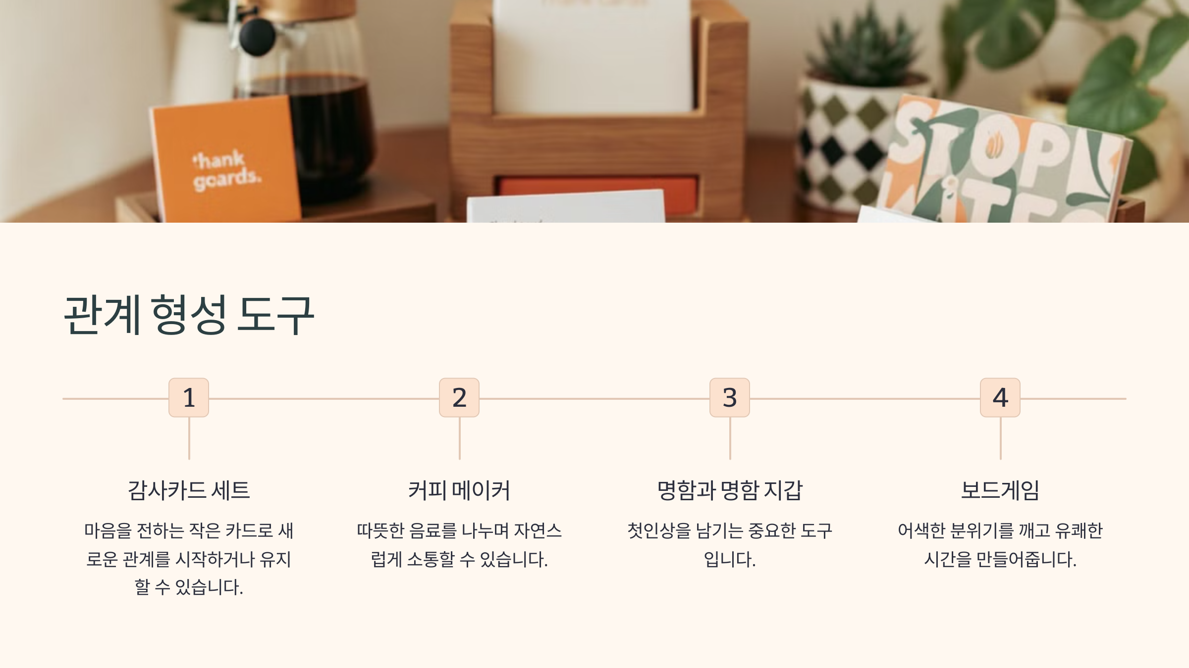 A4. 감사카드, 커피 메이커, 보드게임, 명함과 명함 지갑이 관계 형성에 유용한 아이템이에요.