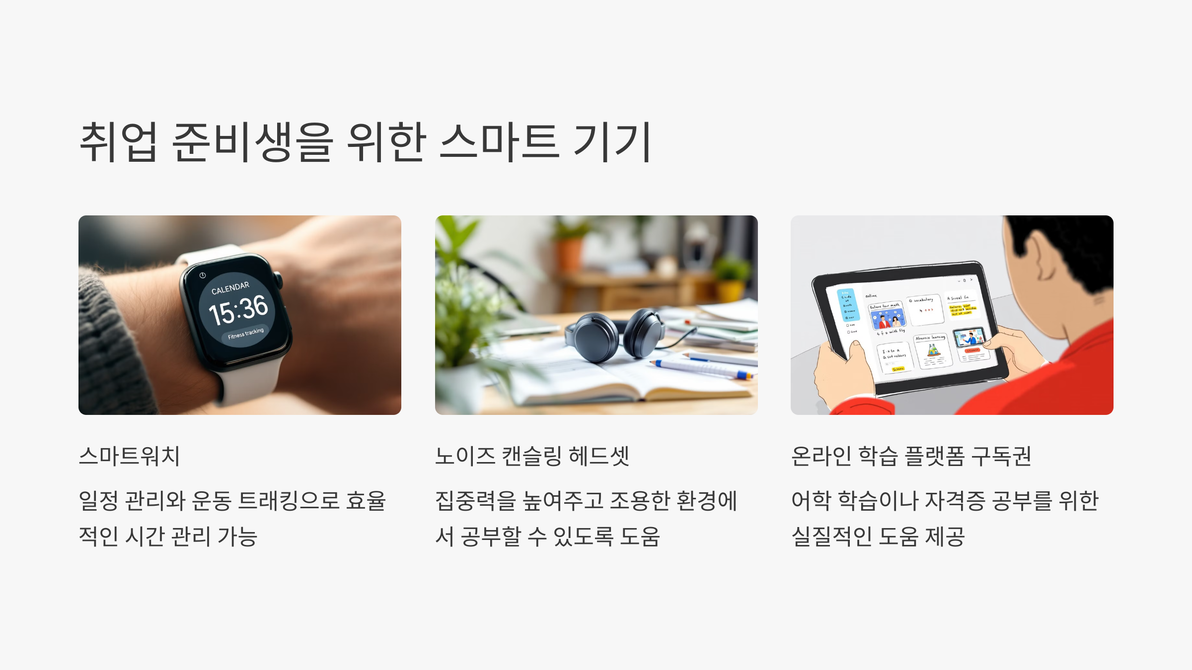 또한, 방해 없이 공부에 몰입할 수 있도록 노이즈 캔슬링 기능이 탑재된 블루투스 헤드셋도 추천해요. 집중력을 높여주고, 조용한 환경에서 면접 준비나 자기계발에 몰두할 수 있도록 도와줄 거예요.