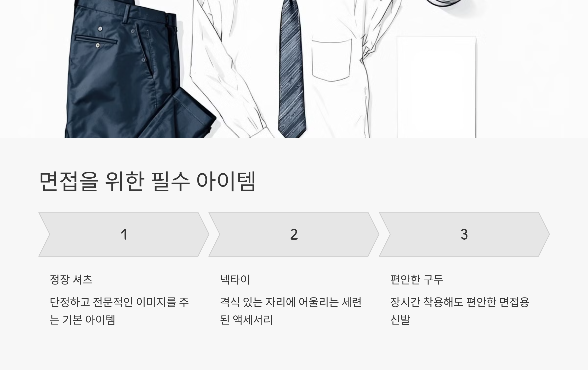 A2. 정장 셔츠, 넥타이, 손목시계, 편안한 구두 같은 패션 아이템이 면접 준비에 큰 도움이 돼요.