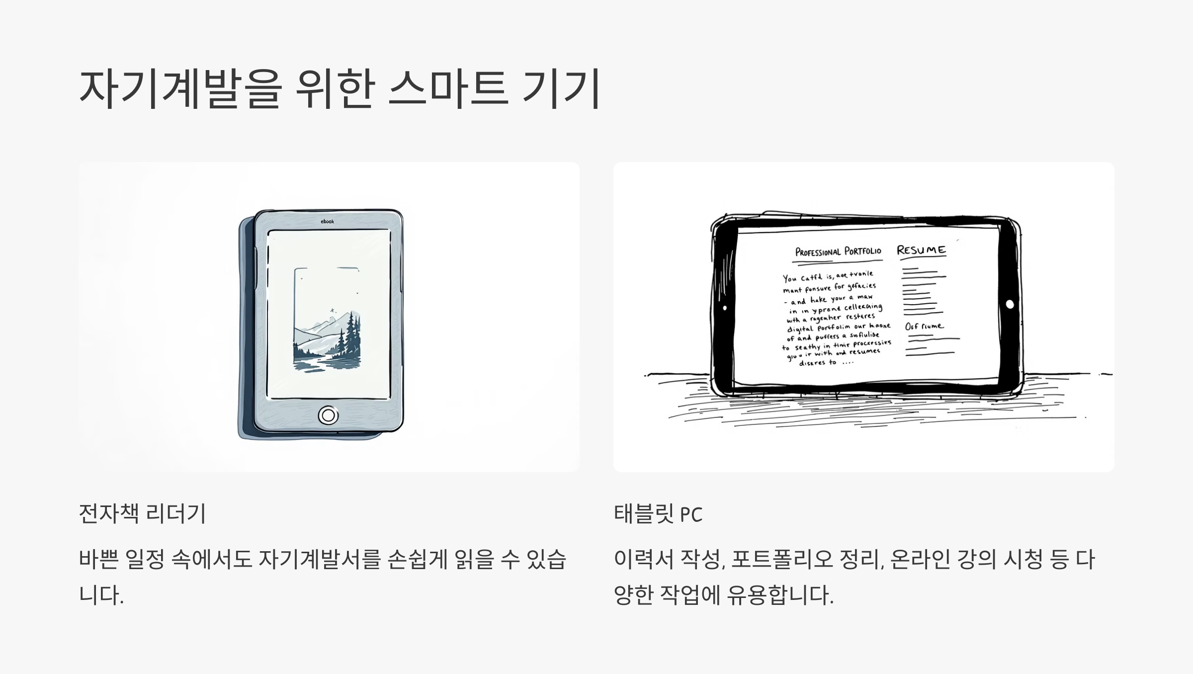 취업 준비 기간은 자기계발의 시간이에요. 전자책 리더기는 바쁜 일정 속에서도 책을 손쉽게 읽을 수 있는 최고의 도구예요. 자기계발서를 읽으며 면접이나 취업 준비에 필요한 영감을 얻을 수 있답니다.