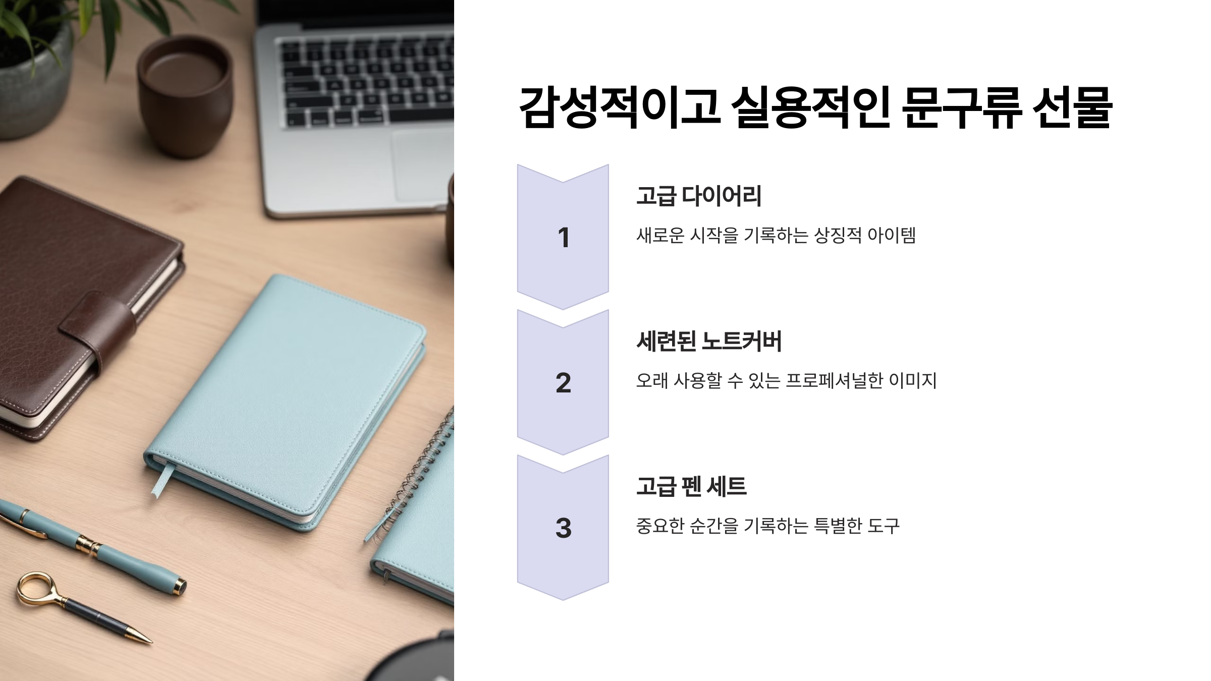 마지막으로, 고급 다이어리도 추천드려요. 일정을 관리하거나 목표를 계획할 때 사용할 수 있는 다이어리는 새 출발을 돕는 상징적인 선물이 될 거예요.