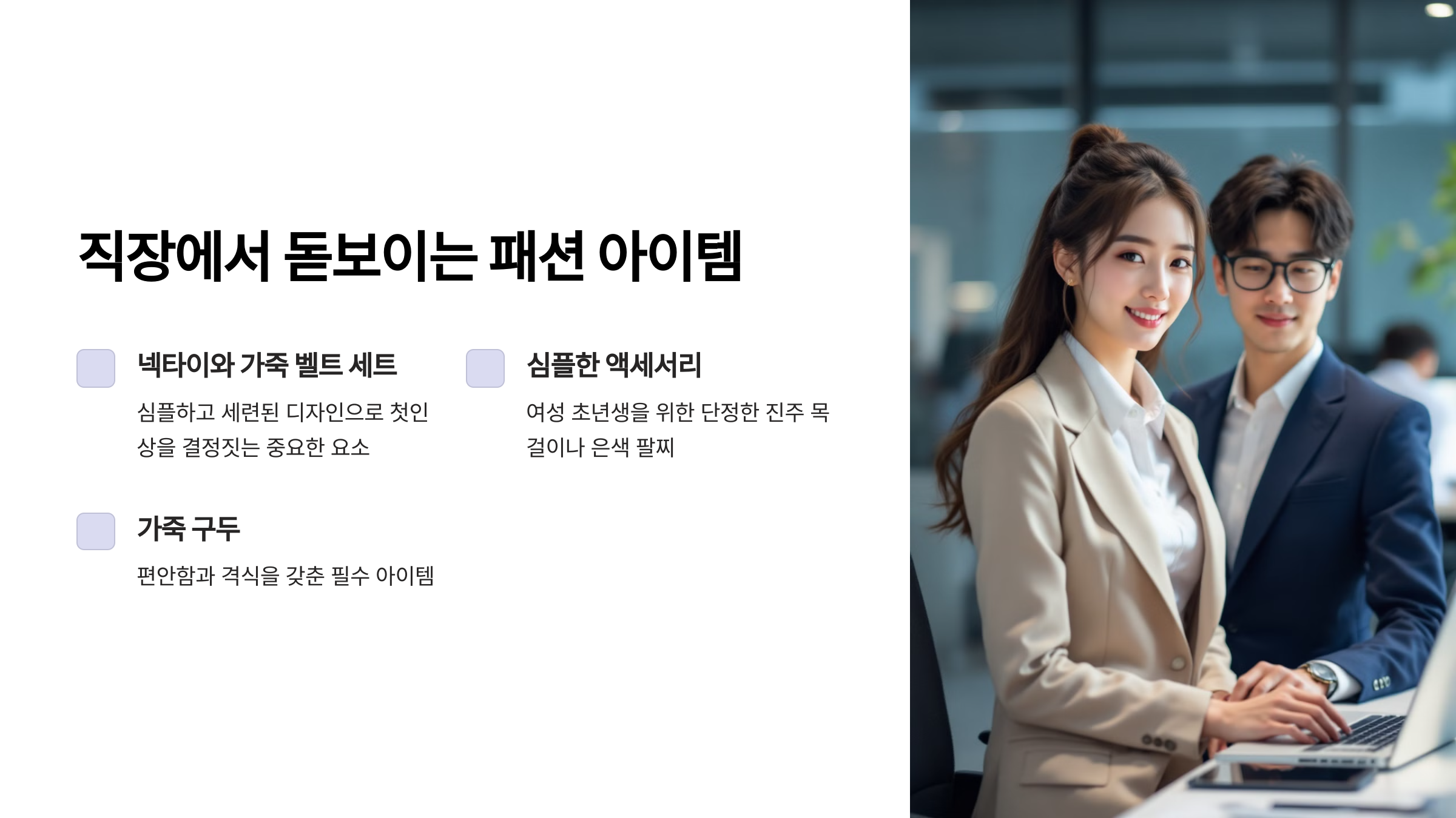 여성 초년생이라면 정장과 어울리는 심플한 액세서리를 추천해요. 예를 들어, 단정한 진주 목걸이나 은색 팔찌는 세련된 이미지를 강조해 줄 수 있어요. 직장 환경에서도 과하지 않으면서도 깔끔한 스타일을 완성할 수 있답니다.