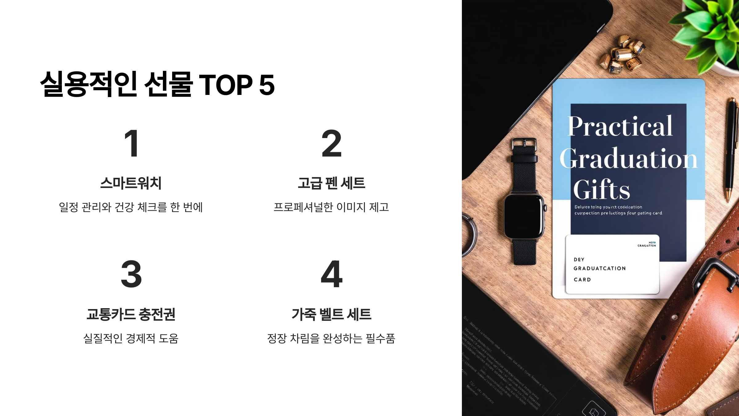 한국 정서에 맞춰 실용성과 예산 모두를 고려해 사회 초년생들에게 사랑받을 만한 TOP 5 졸업 선물을 추천드릴게요! 이 리스트를 참고하면 특별하고 의미 있는 선물을 준비할 수 있을 거예요.