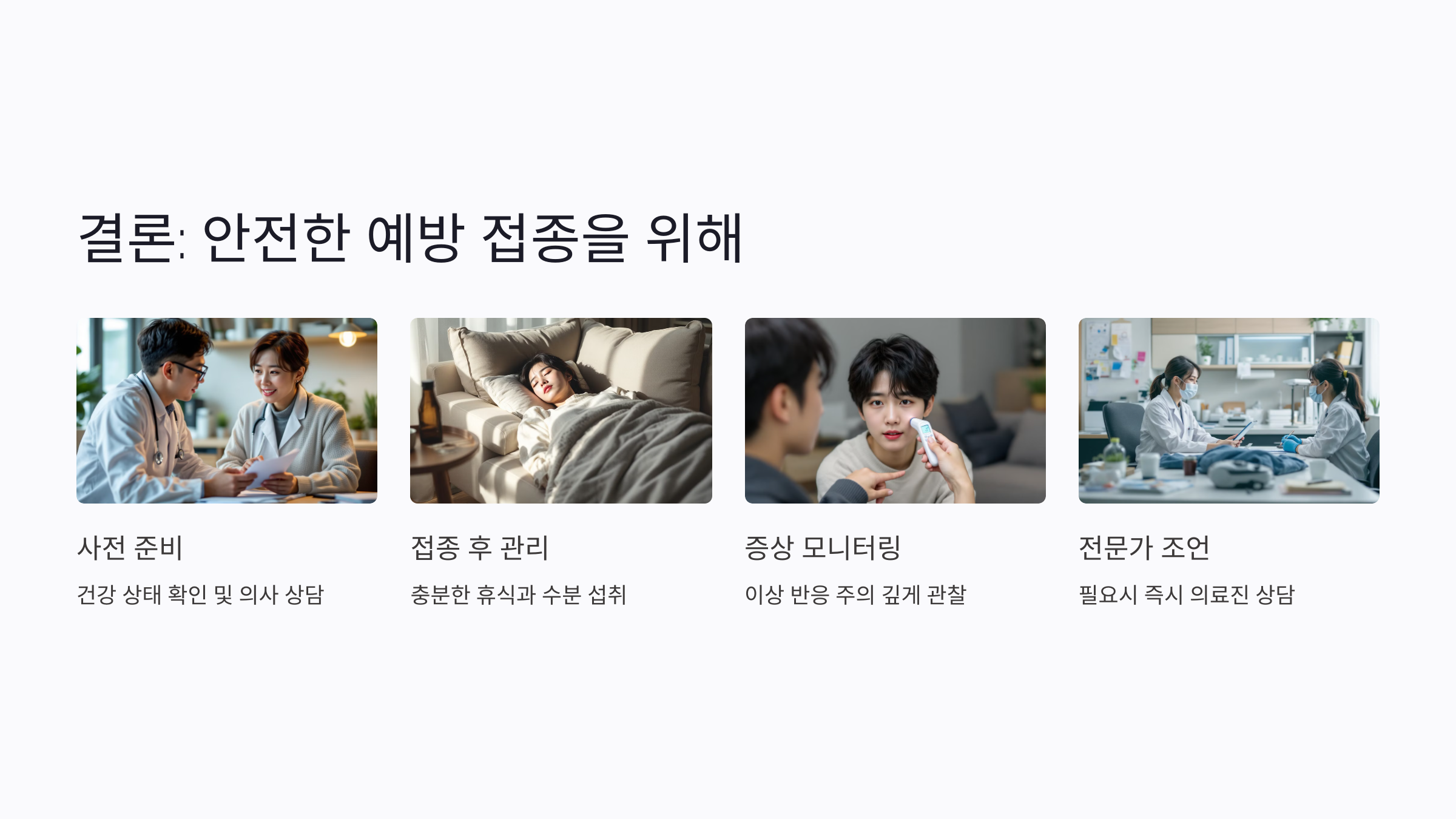 예방 접종 후에는 몸 상태를 잘 관찰하며, 몸이 필요로 하는 휴식과 수분을 충분히 공급하는 것이 중요해요. 부작용이 심하지 않더라도 적절한 관리가 필요한 이유랍니다.