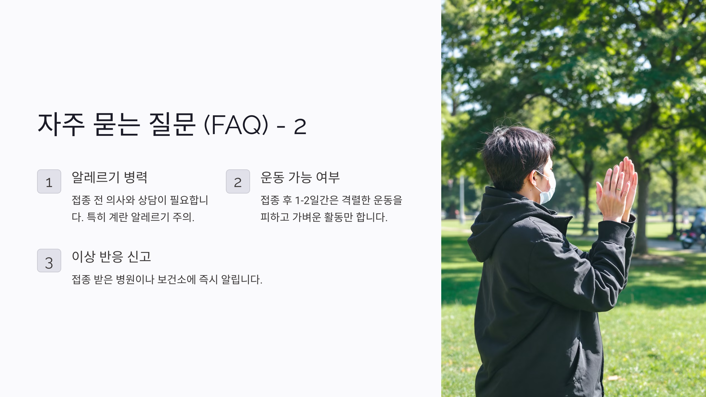 A5. 접종 당일과 그다음 날은 몸 상태를 관찰하며 격렬한 운동을 피하세요. 가벼운 스트레칭이나 산책 정도는 괜찮지만, 무리하지 않는 것이 좋아요.