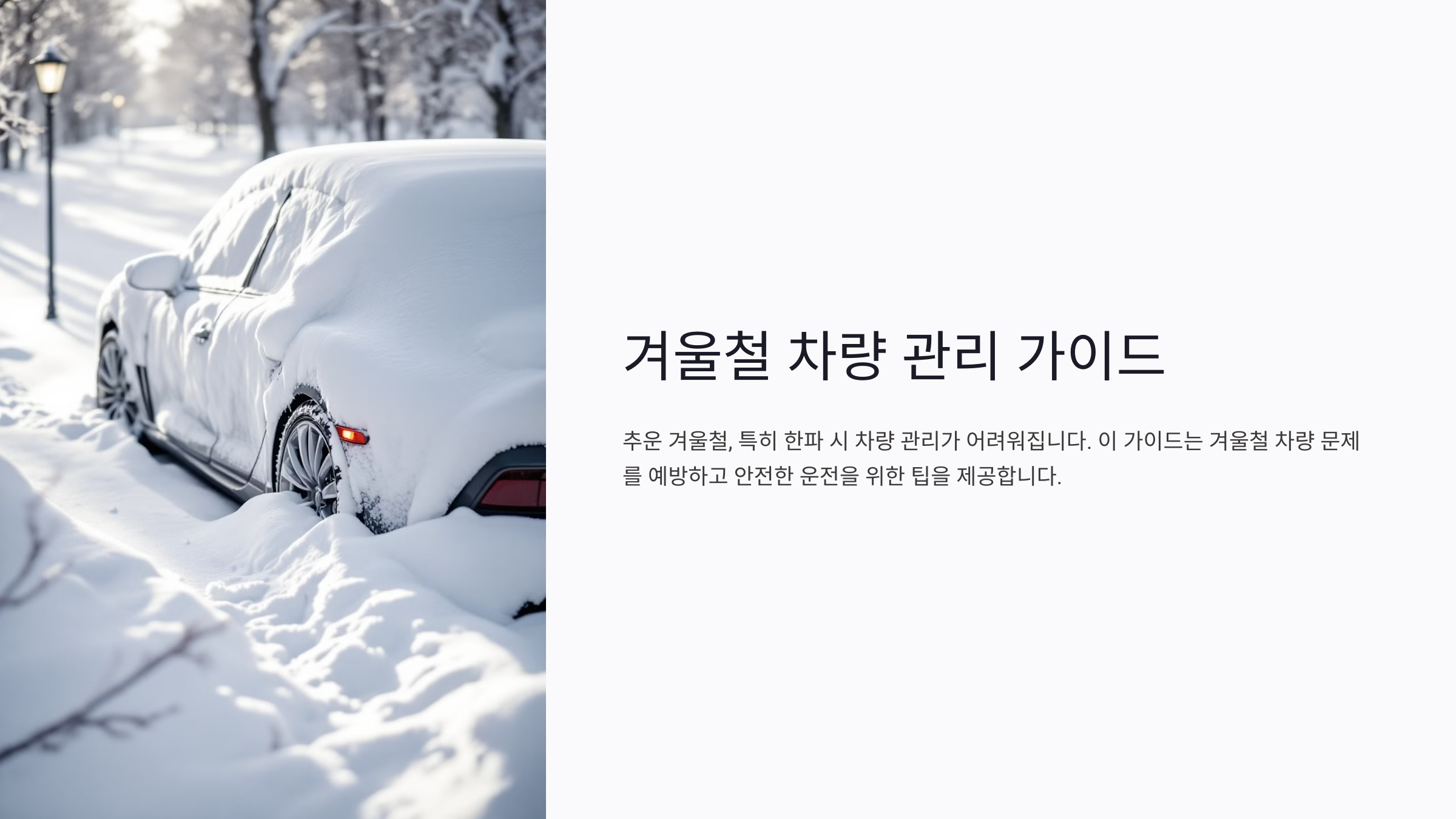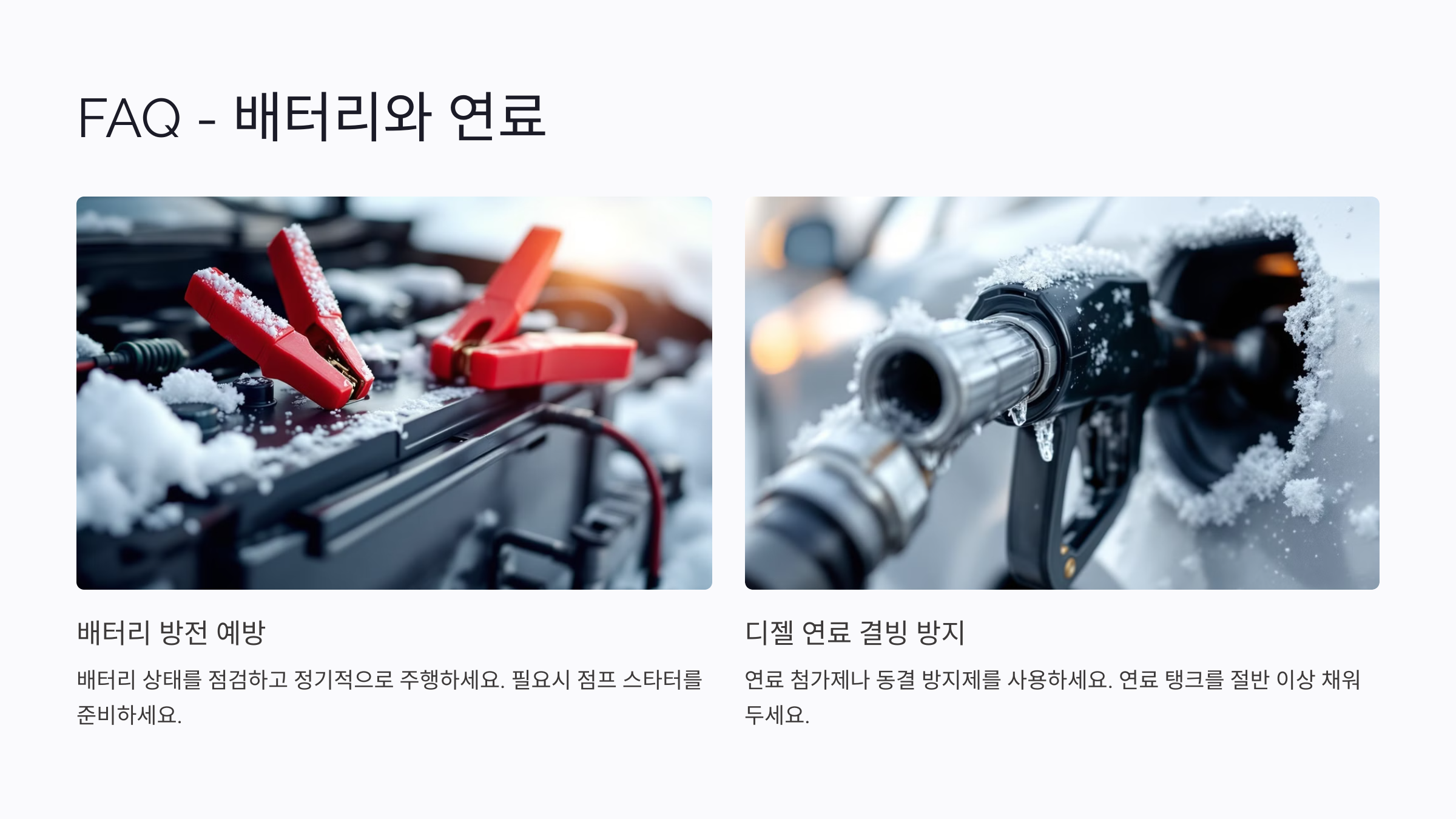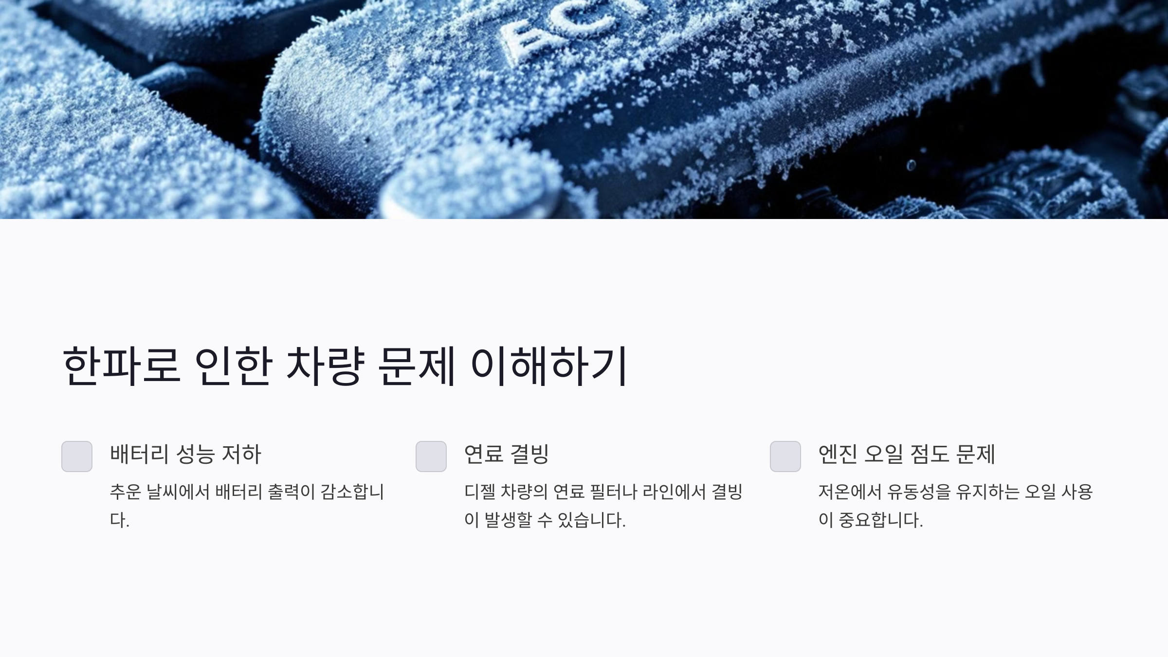 추운 겨울철, 특히 한파가 몰아칠 때 차량 관리가 어려워지는 경우가 많아요. 아침 출근길에 시동이 꺼지거나 차량이 작동하지 않으면 정말 난감할 수 있죠. 겨울철 차량 문제는 배터리 방전, 연료 결빙, 타이어 공기압 저하 등 다양한 원인에서 비롯되곤 해요. 한파가 오기 전에 대비책을 마련하면 갑작스러운 상황에도 여유롭게 대처할 수 있답니다.