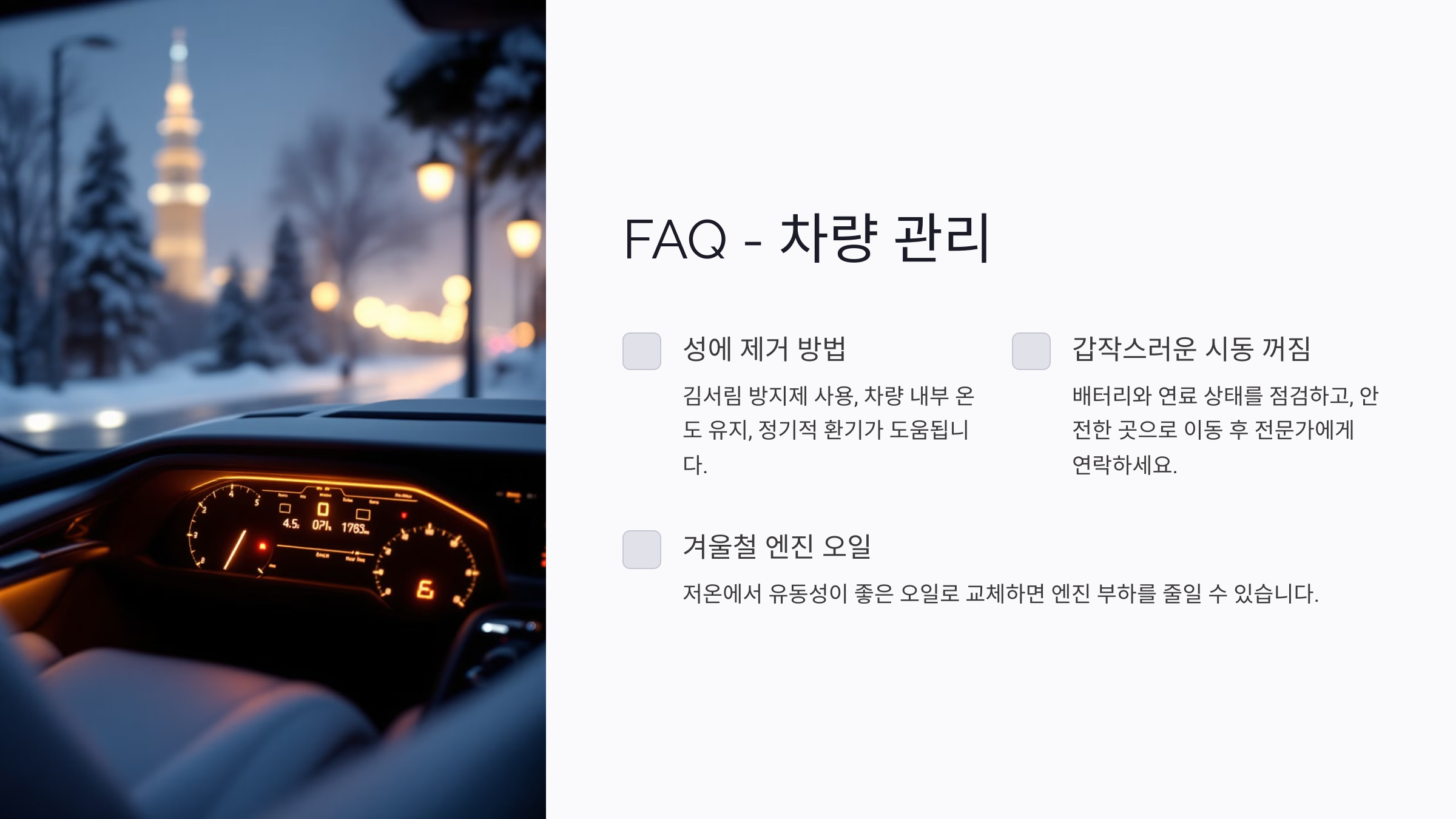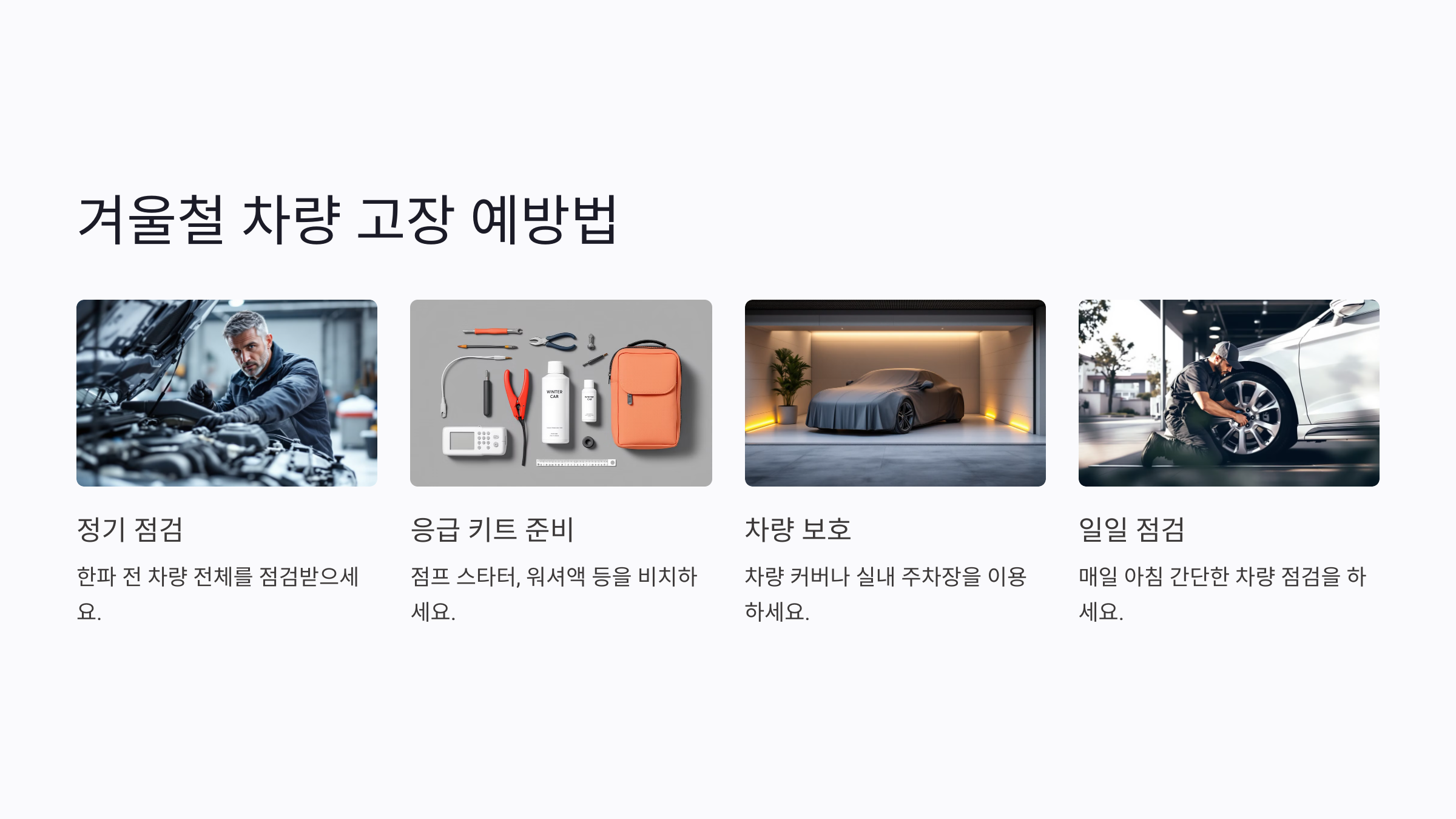 겨울철 차량 고장은 대부분 사소한 부주의에서 발생해요. 한파가 오기 전에 차량을 전체적으로 점검받는 것이 가장 좋은 예방책이에요. 정비소를 방문해 배터리, 엔진 오일, 냉각수, 연료 시스템 등을 점검받으세요. 차량 관리 앱을 활용하면 점검 주기를 쉽게 관리할 수 있어요.