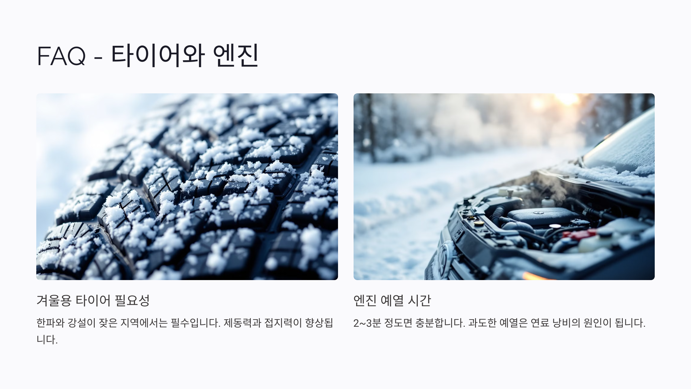 A3. 한파와 강설이 잦은 지역에서는 겨울용 타이어가 필수예요. 제동력과 접지력이 훨씬 좋아 안전하게 주행할 수 있어요.