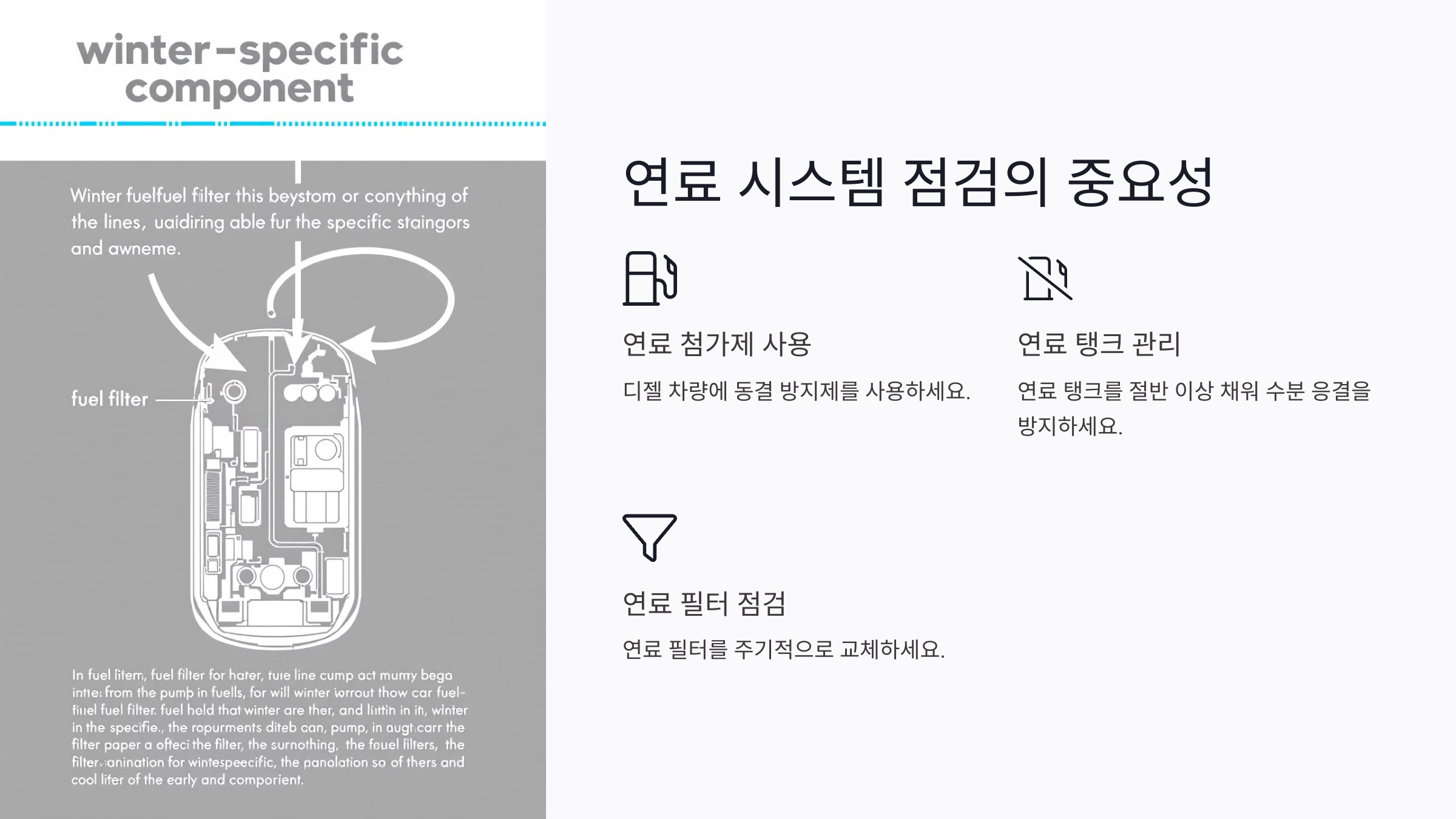 겨울철 연료 시스템 관리도 매우 중요해요. 특히 디젤 차량의 경우, 연료 라인이나 필터에 포함된 수분이 얼어 연료 흐름을 방해할 수 있어요. 이를 방지하기 위해 디젤 차량에는 겨울철 동결 방지제가 필수랍니다. 주유할 때 연료 첨가제를 사용하면 연료 결빙 위험을 크게 줄일 수 있어요.