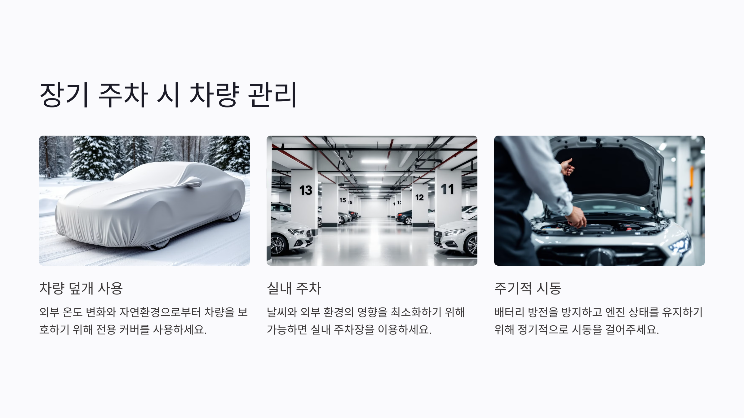 A8. 차량 덮개를 사용하거나 실내 주차를 활용하세요. 시동을 주기적으로 걸어주는 것도 도움이 돼요.