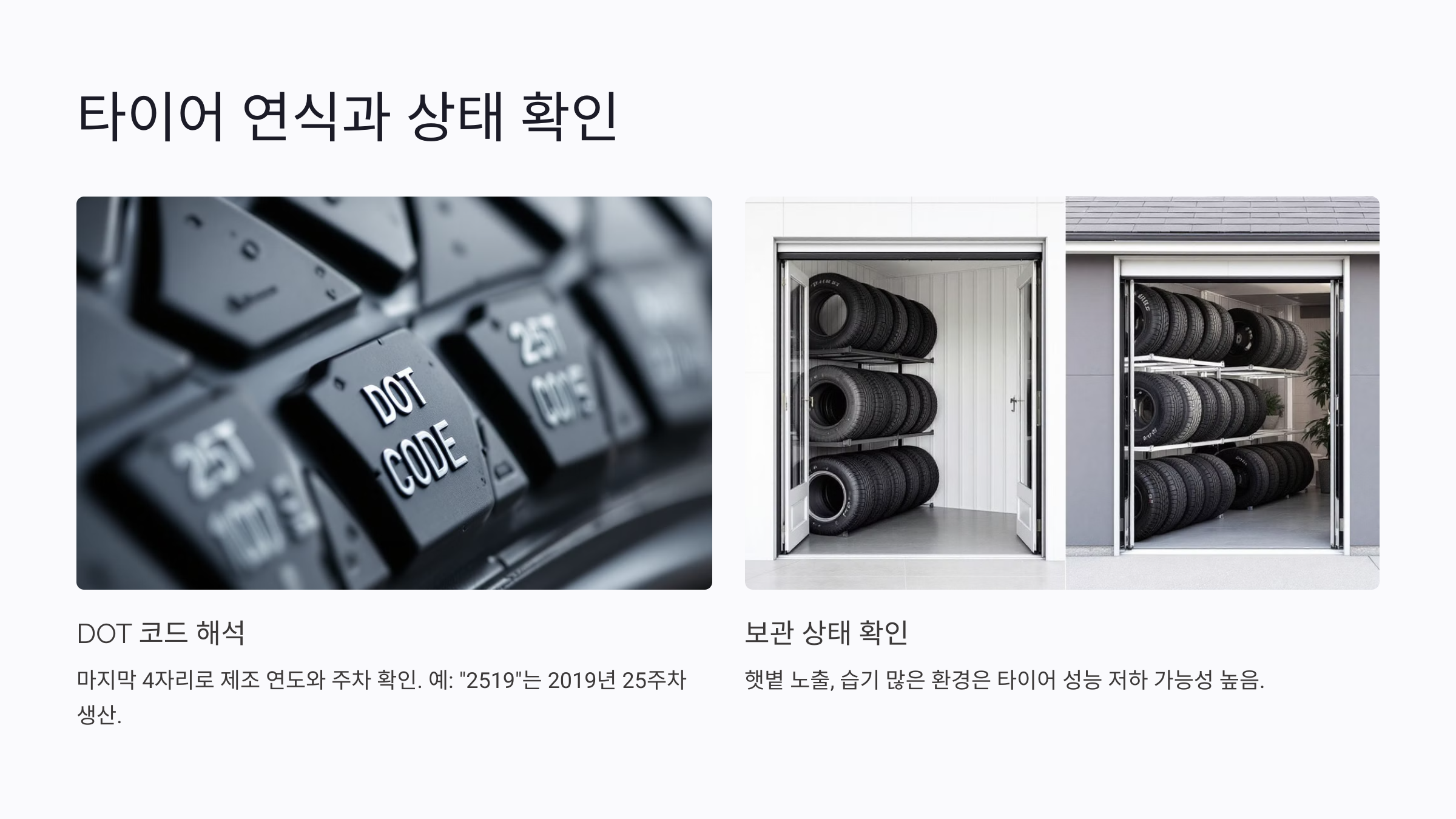 타이어의 연식은 성능에 직접적인 영향을 미쳐요. 앞서 언급한 DOT 코드에서 마지막 4자리 숫자를 통해 제조 연도를 확인할 수 있는데, 예를 들어 "2519"라면 2019년 25주차에 생산된 타이어를 의미해요. 일반적으로 타이어는 제조 후 5년 이내가 가장 적합하며, 시간이 지날수록 고무가 경화되어 접지력이 떨어질 수 있답니다.