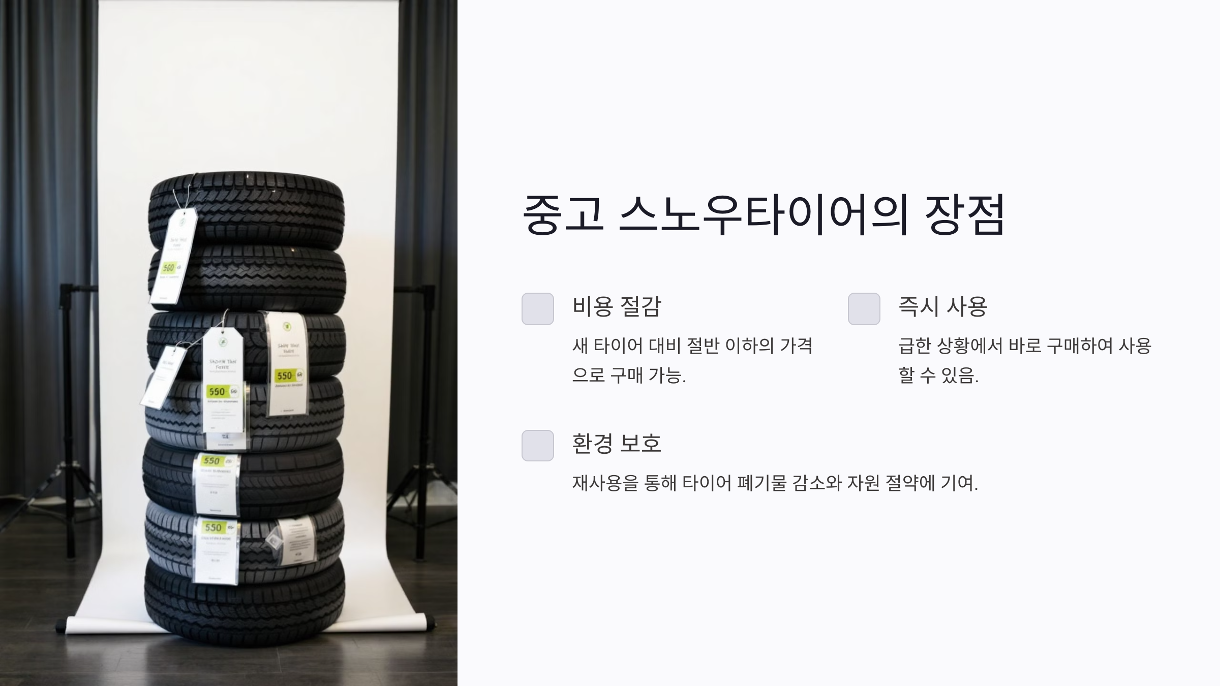 중고 스노우타이어를 선택하는 가장 큰 이유는 비용 절감이에요. 새 타이어는 한 세트(4개) 기준으로 수십만 원 이상 드는 경우가 많지만, 중고 타이어는 절반 이하의 가격으로 구매할 수 있어요. 특히 주행 거리가 짧거나 겨울철에만 차량을 사용하는 경우라면 중고 타이어가 실용적인 선택이 될 수 있답니다.