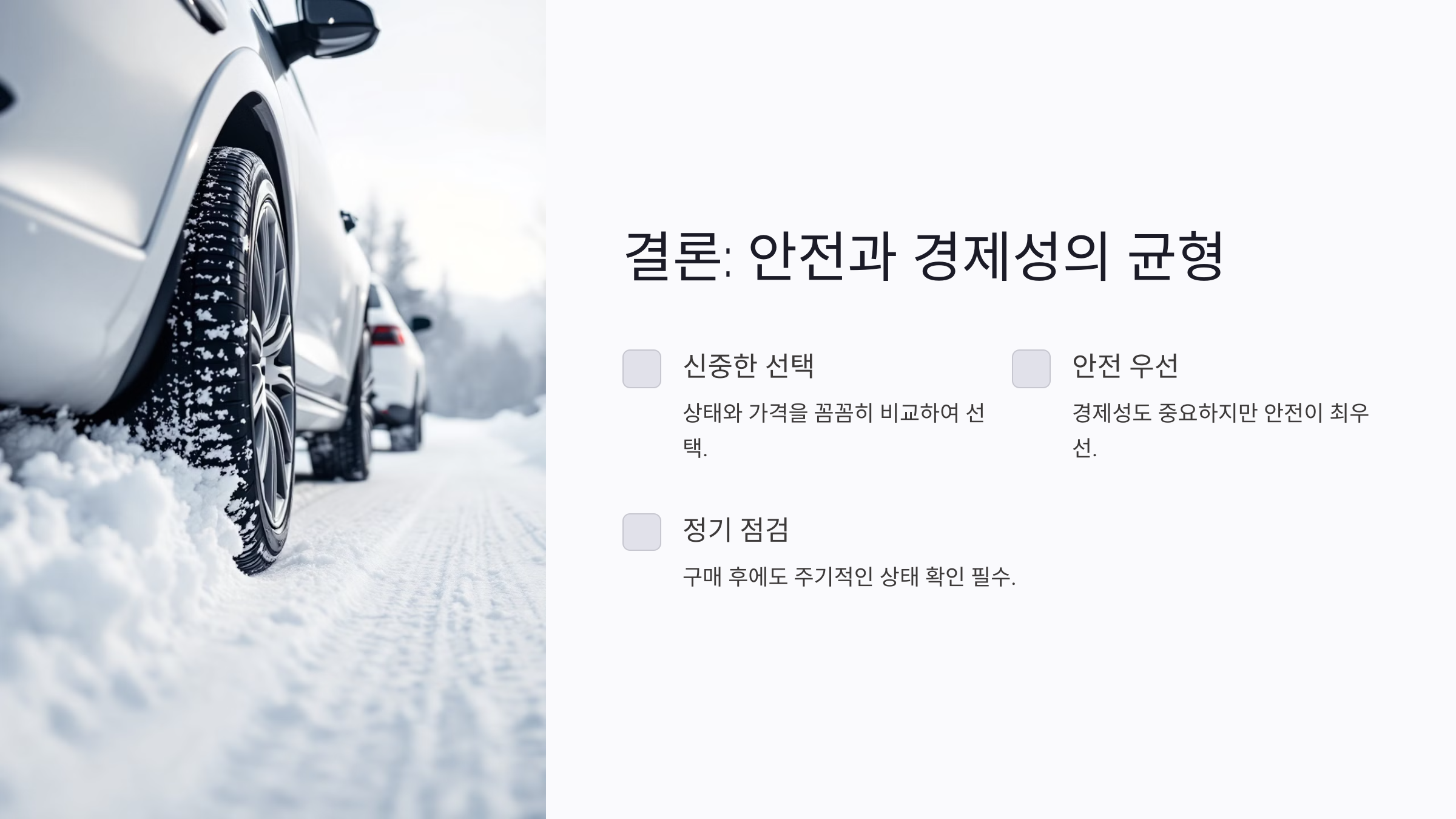 새 타이어는 높은 초기 비용이 들지만, 성능과 안전성이 보장되며 더 오랜 기간 사용할 수 있어요. 주행 거리가 많거나 눈이 자주 내리는 지역에서 운전하는 경우라면 새 타이어를 선택하는 것이 더 합리적일 수 있어요.