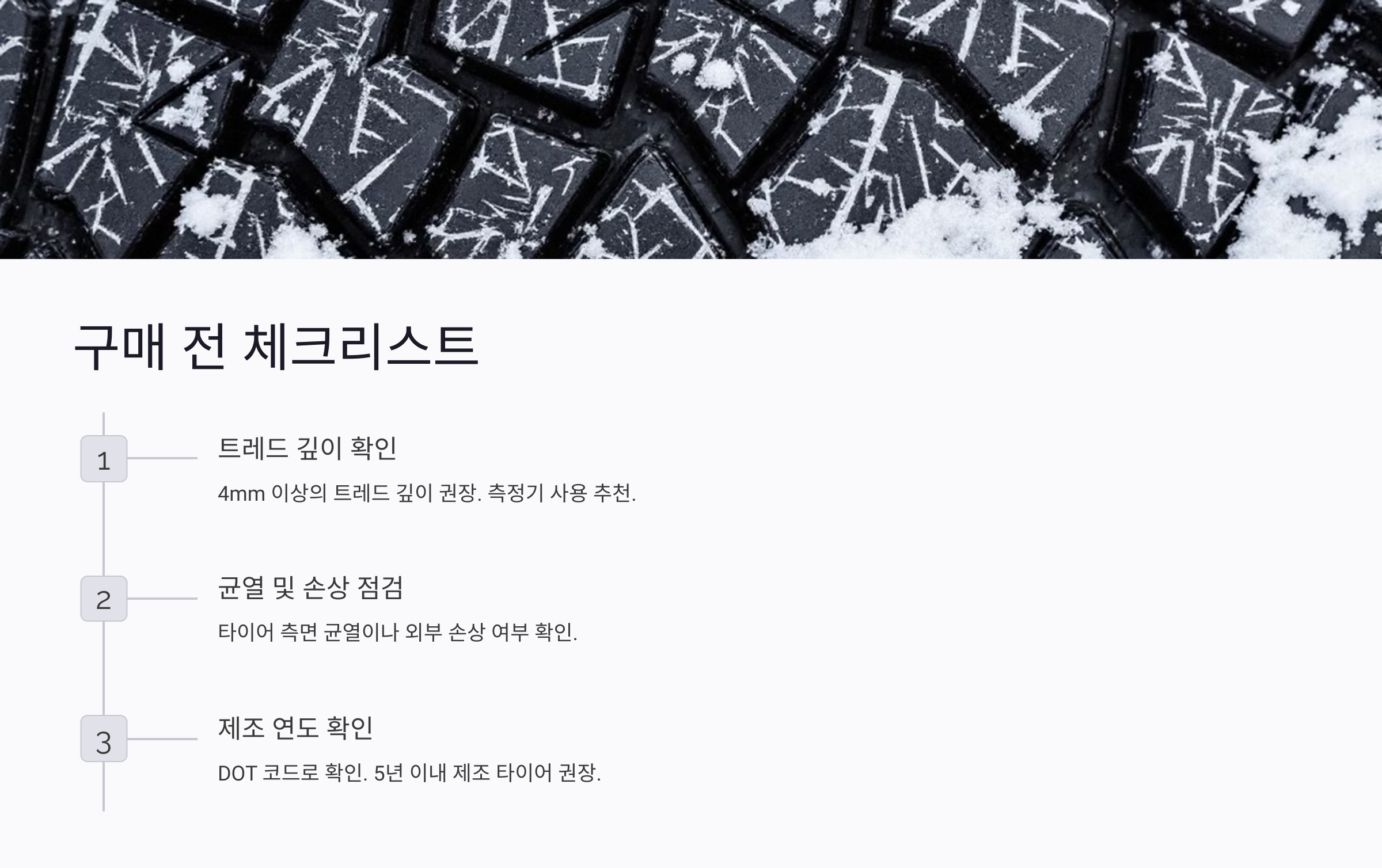 중고 스노우타이어를 구매하기 전에는 반드시 제품 상태를 철저히 점검해야 해요. 다음은 확인해야 할 주요 항목들이에요.