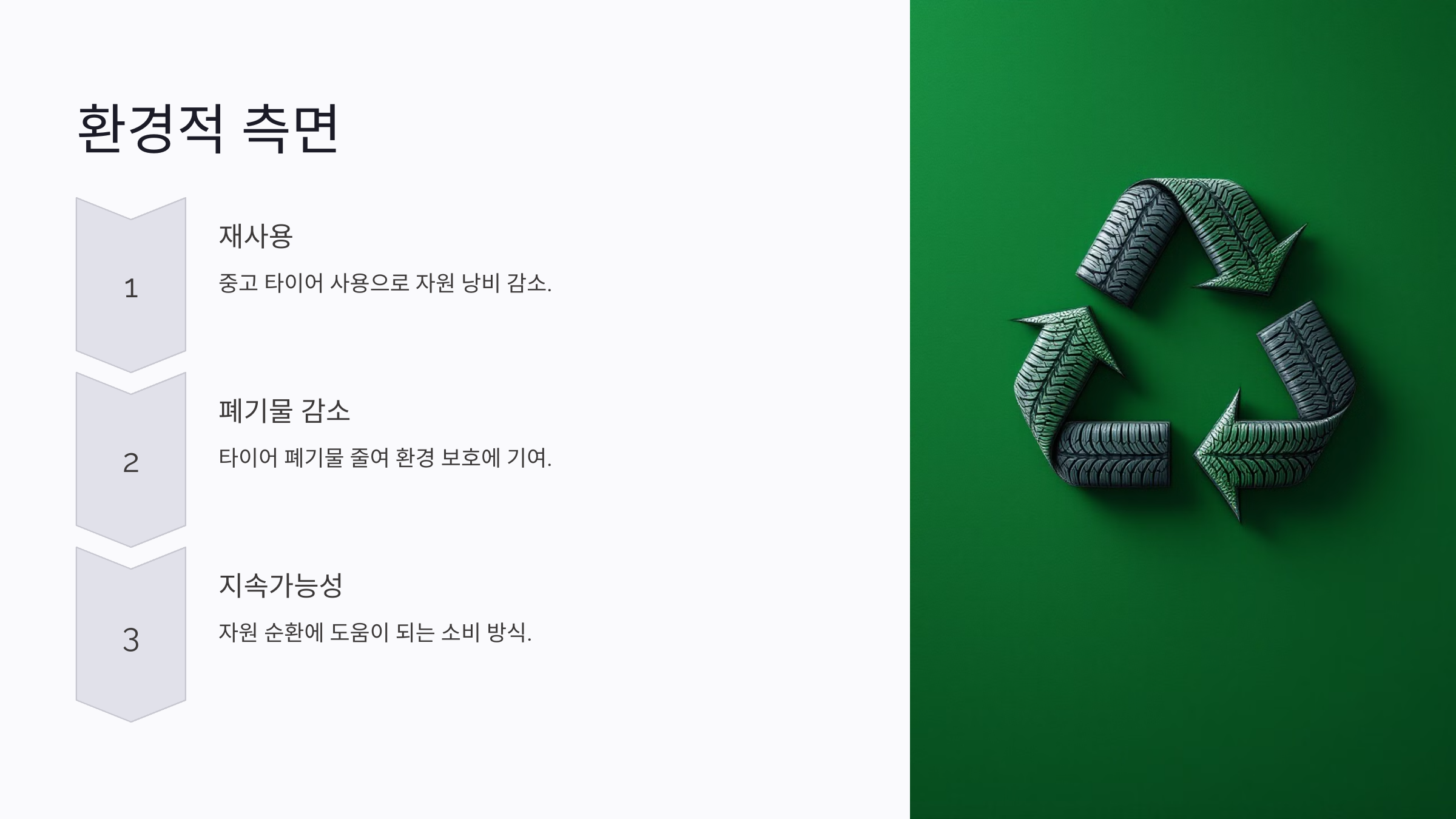 A8. 중고 타이어를 재사용하면 자원 낭비를 줄이고 환경 보호에 기여할 수 있어요. 하지만 안전성을 최우선으로 고려해야 해요.