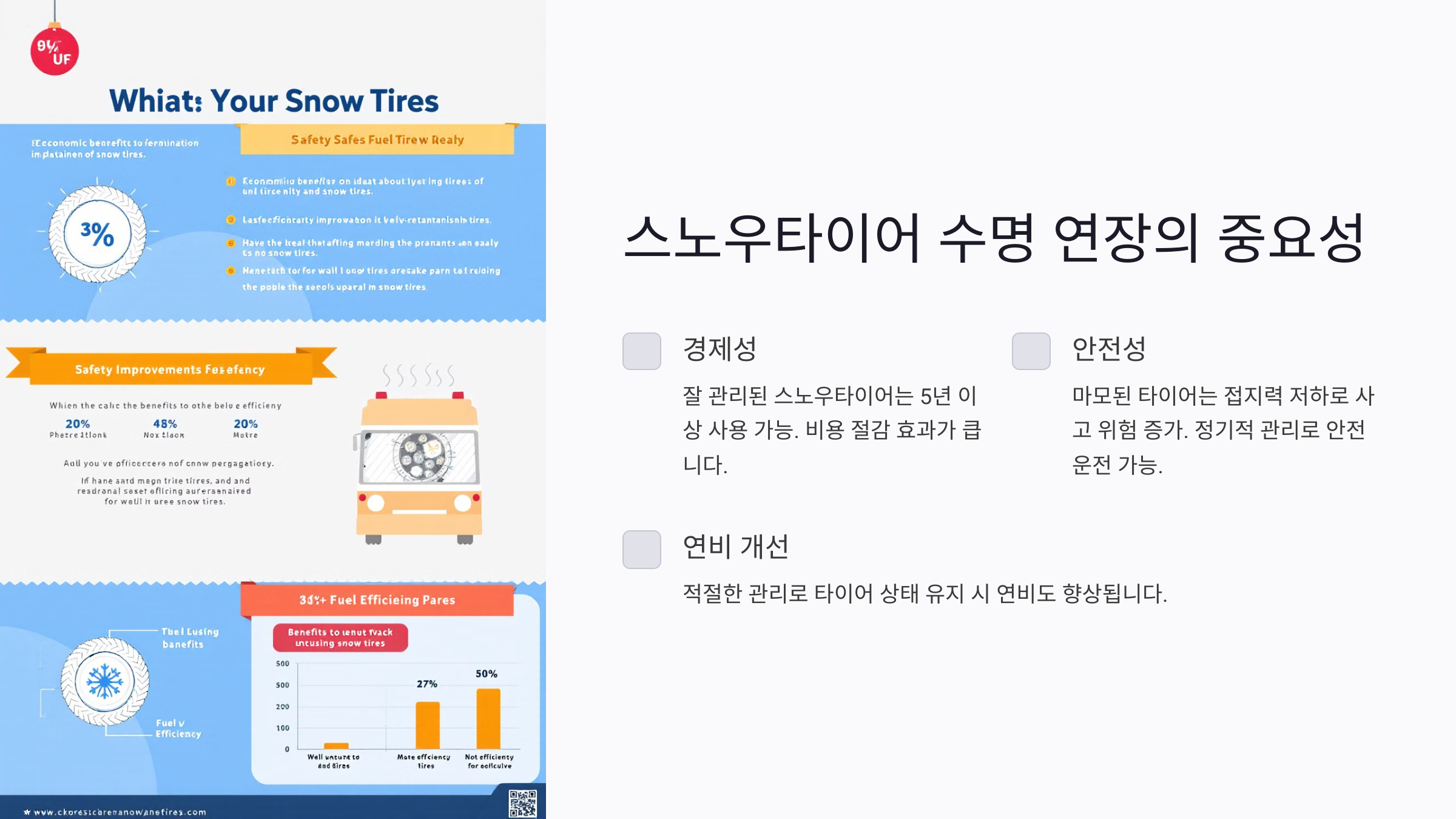 스노우타이어를 적절히 관리하면 연비 개선에도 긍정적인 영향을 미쳐요. 마모된 타이어는 더 많은 에너지를 소모하게 만들어 연비를 낮출 수 있지만, 적절한 관리로 타이어 상태를 유지하면 연비도 함께 향상될 수 있어요.