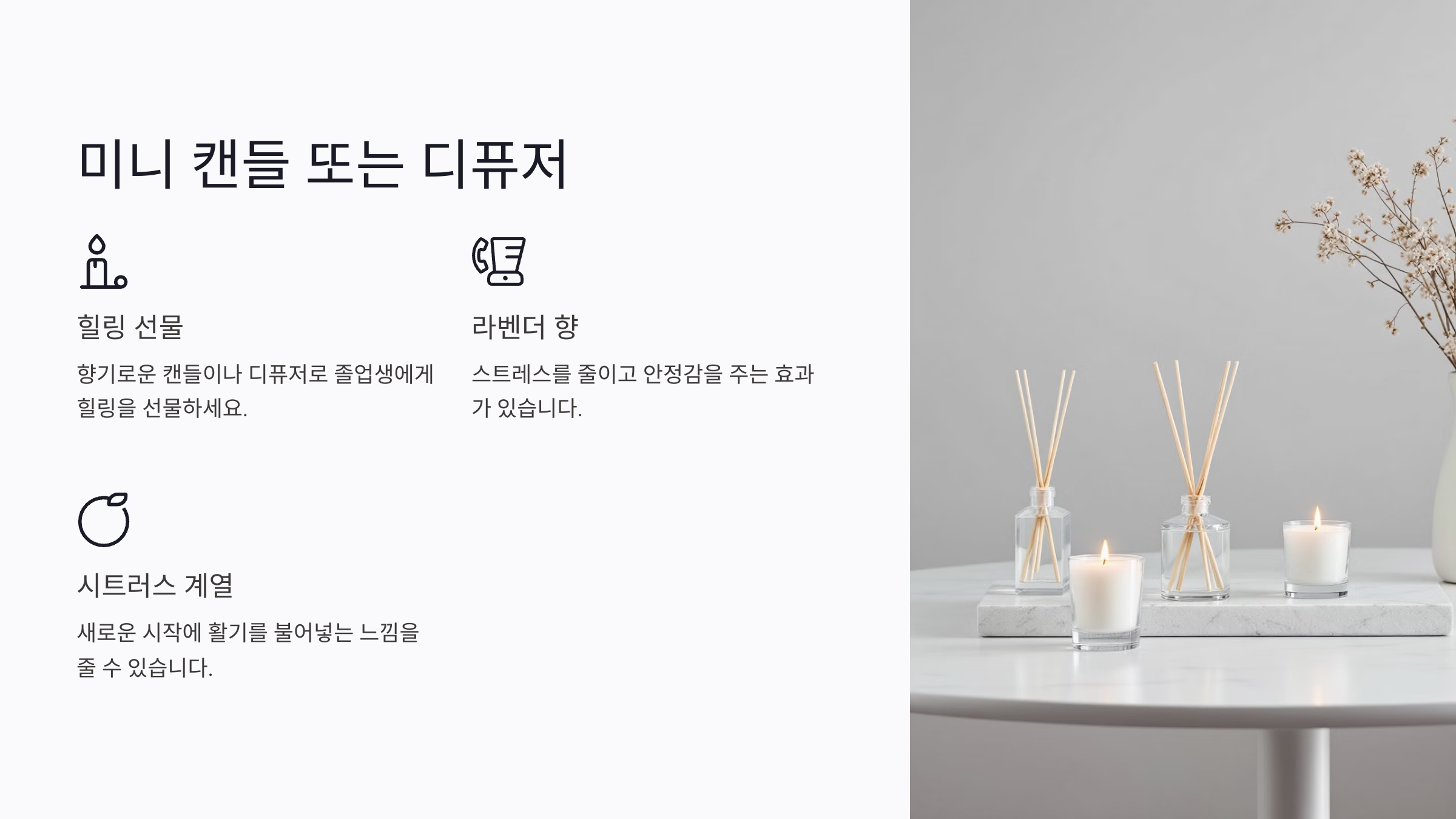 향기로운 캔들이나 디퓨저는 졸업생에게 힐링을 선물할 수 있는 아이템이에요. 요즘에는 5,000원~1만 원대의 고급스러운 디자인의 미니 캔들, 디퓨저를 쉽게 찾을 수 있답니다.
