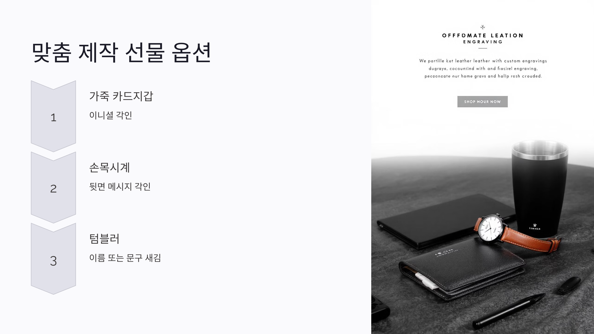 A2. 가죽 카드지갑, 손목시계, 텀블러는 이니셜 각인 서비스를 통해 맞춤 제작이 가능해요. 졸업생만의 특별한 의미를 더할 수 있답니다.