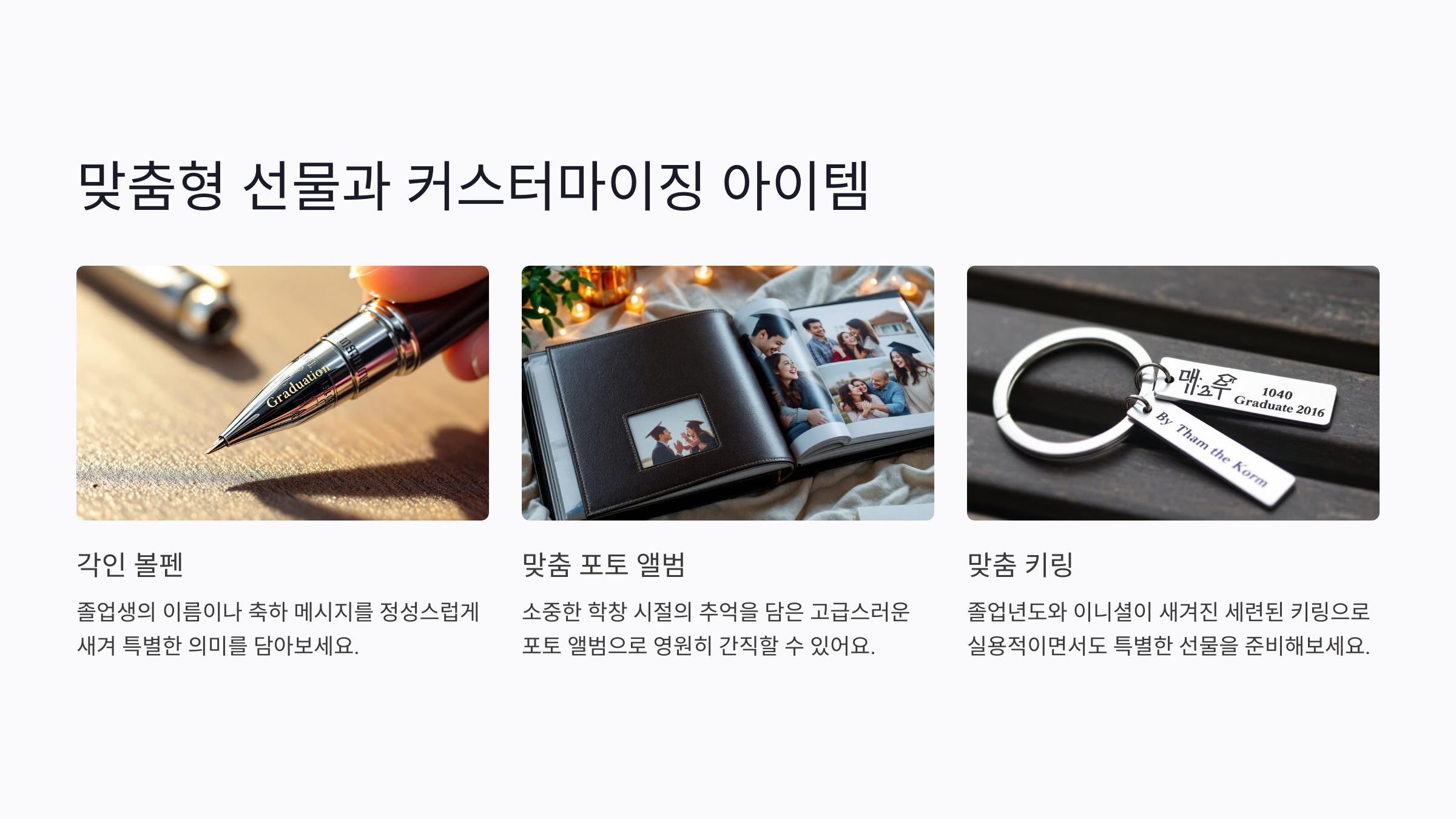 맞춤형 선물은 졸업생만을 위한 특별함을 전달할 수 있어요. 이름, 이니셜, 또는 특별한 문구를 새길 수 있는 아이템은 졸업을 더욱 의미 있게 만들어 줄 거예요.