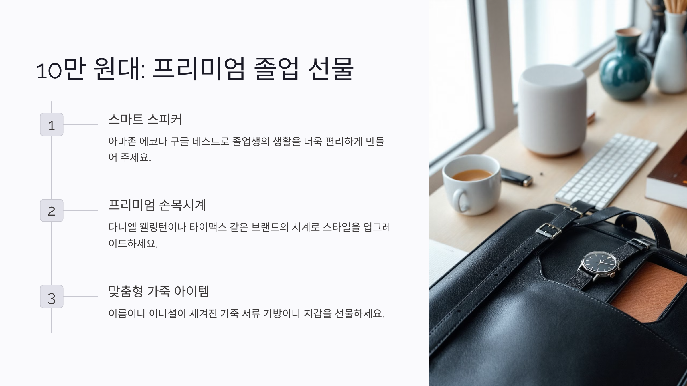 10만 원대는 프리미엄급 선물을 고려할 수 있는 예산이에요. 졸업생이 오랫동안 간직하고 사용할 수 있는 고급스러운 아이템이 추천됩니다.