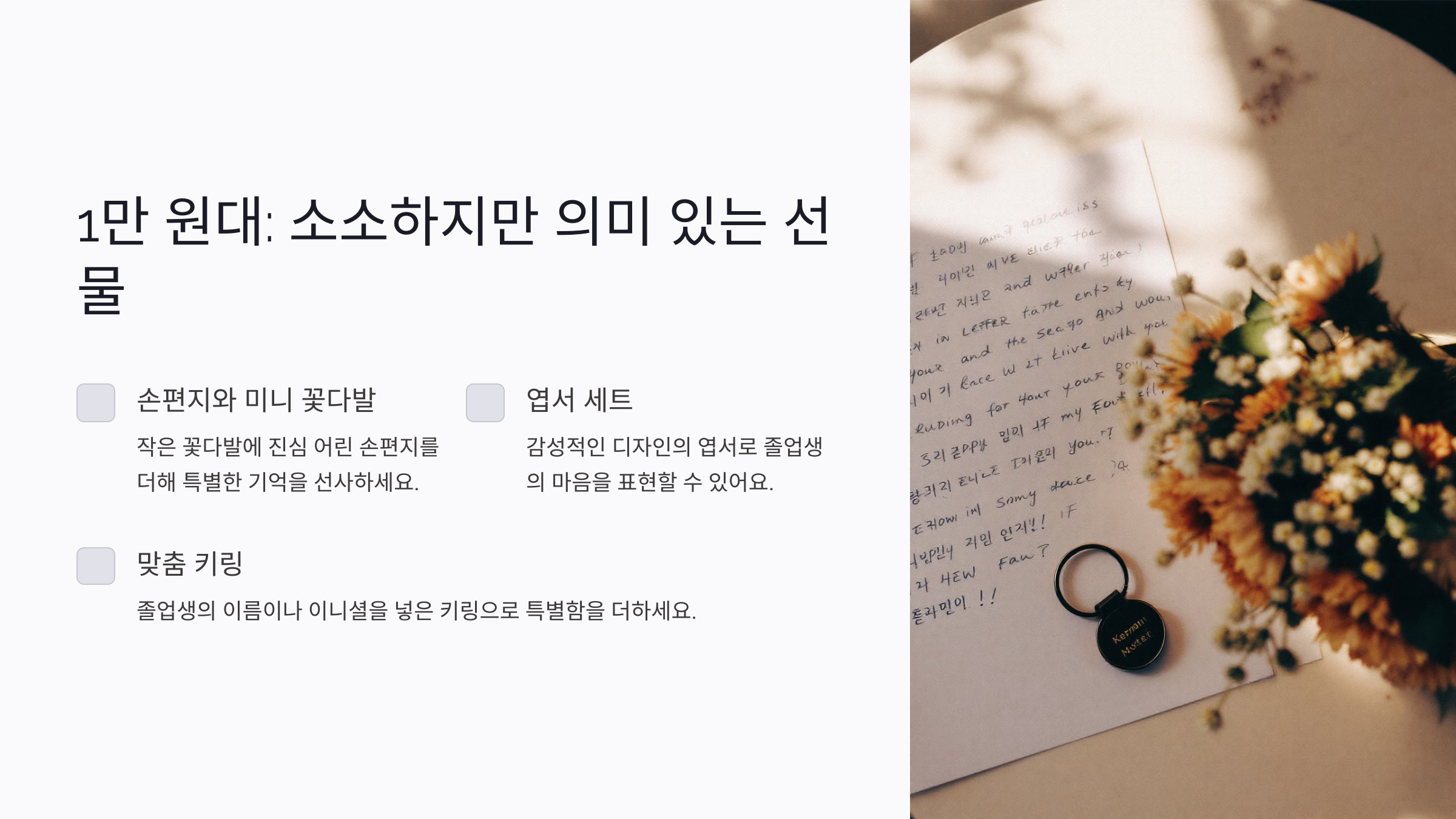 1만 원대 예산으로도 졸업생에게 의미 있는 선물을 준비할 수 있어요. 소소하지만 마음을 담아 준비하면 큰 감동을 줄 수 있답니다.