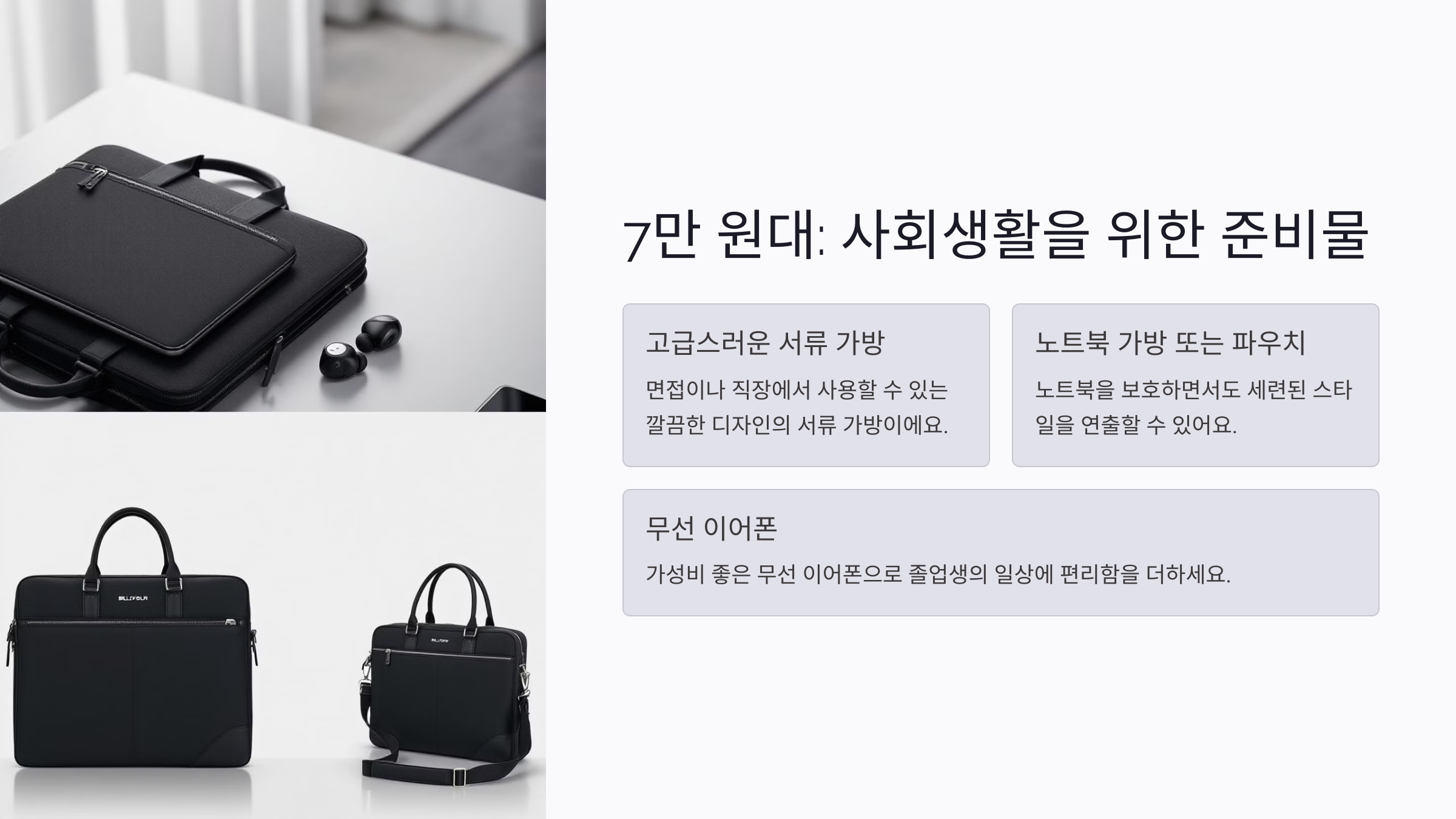 7만 원대 예산으로는 사회생활을 시작하는 졸업생에게 꼭 필요한 아이템들을 선택할 수 있어요. 세련된 디자인과 실용성을 겸비한 선물은 졸업생의 일상에서 큰 도움을 줄 거예요.