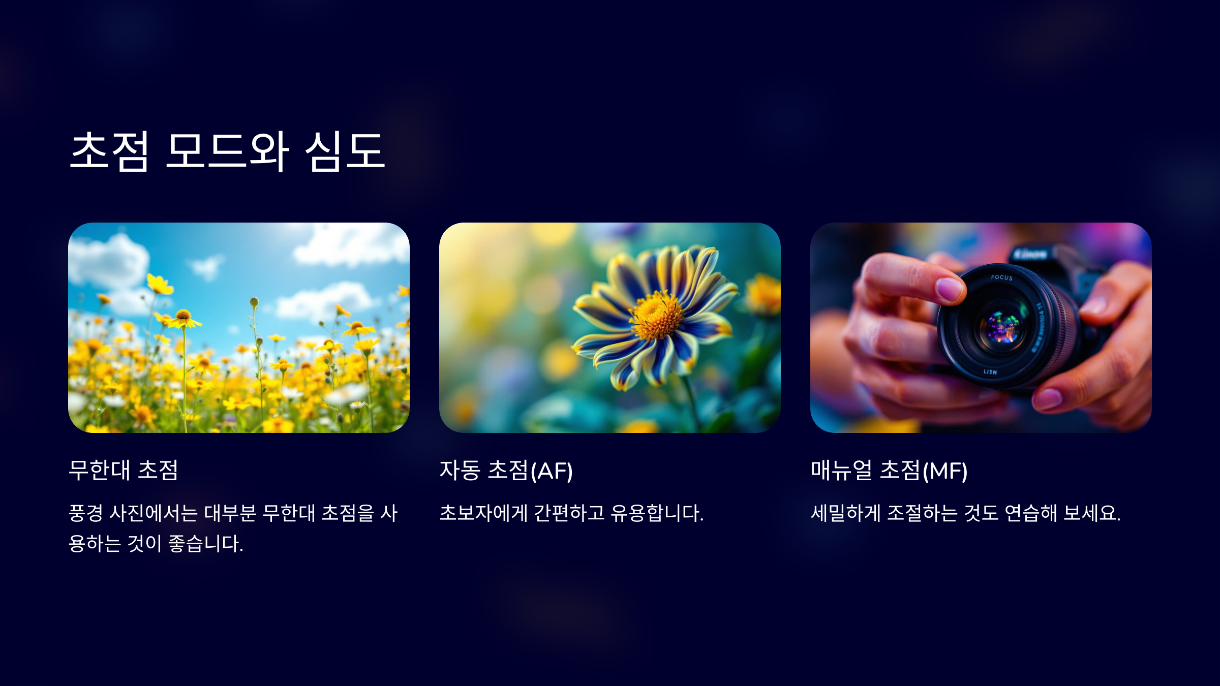 초점 설정은 풍경의 깊이감과 선명도를 좌우합니다.