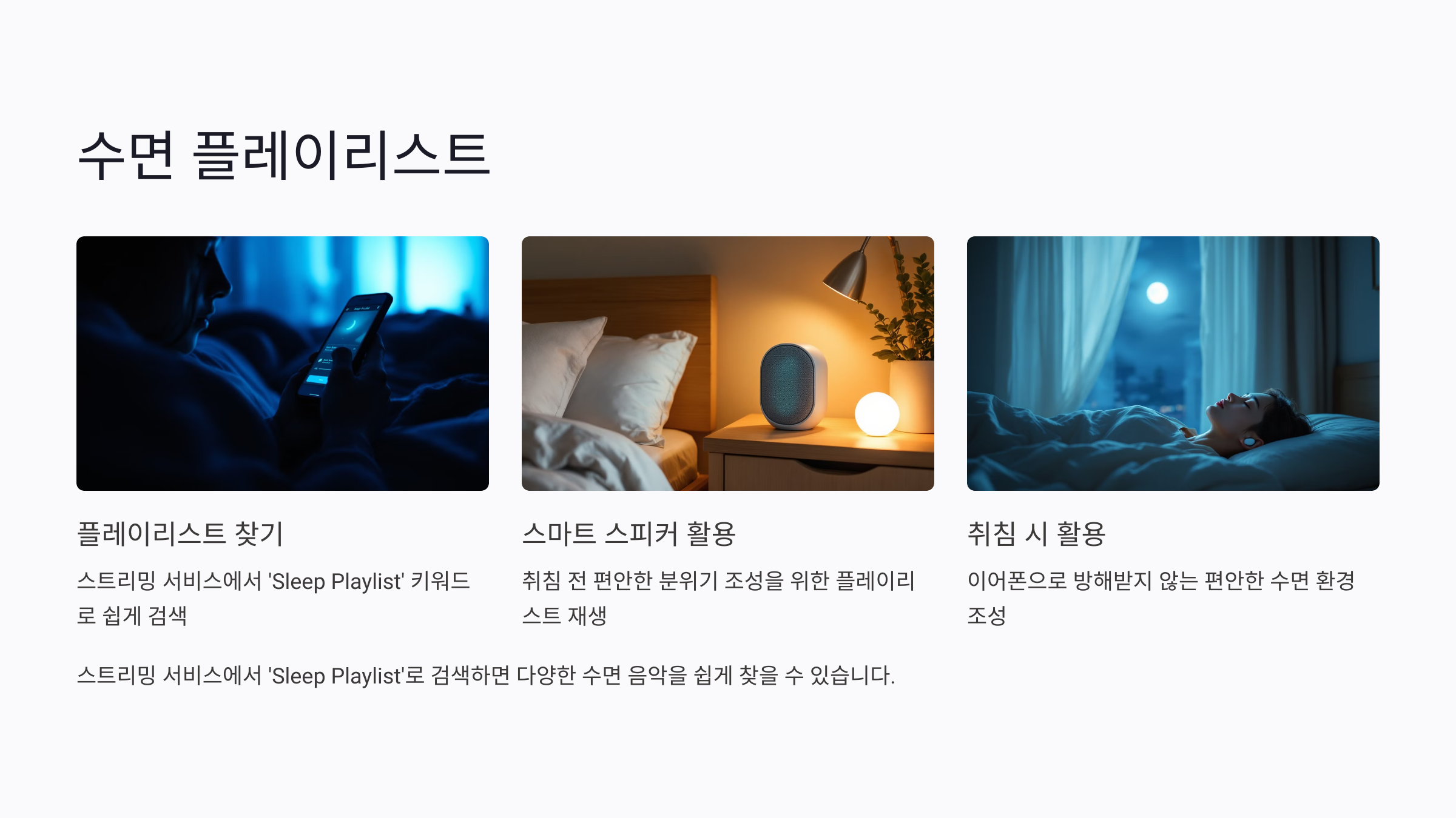 A3. 유튜브, 스포티파이, 멜론, 사운드클라우드 등 다양한 플랫폼에서 수면 음악 플레이리스트를 손쉽게 찾아 들을 수 있어요.
